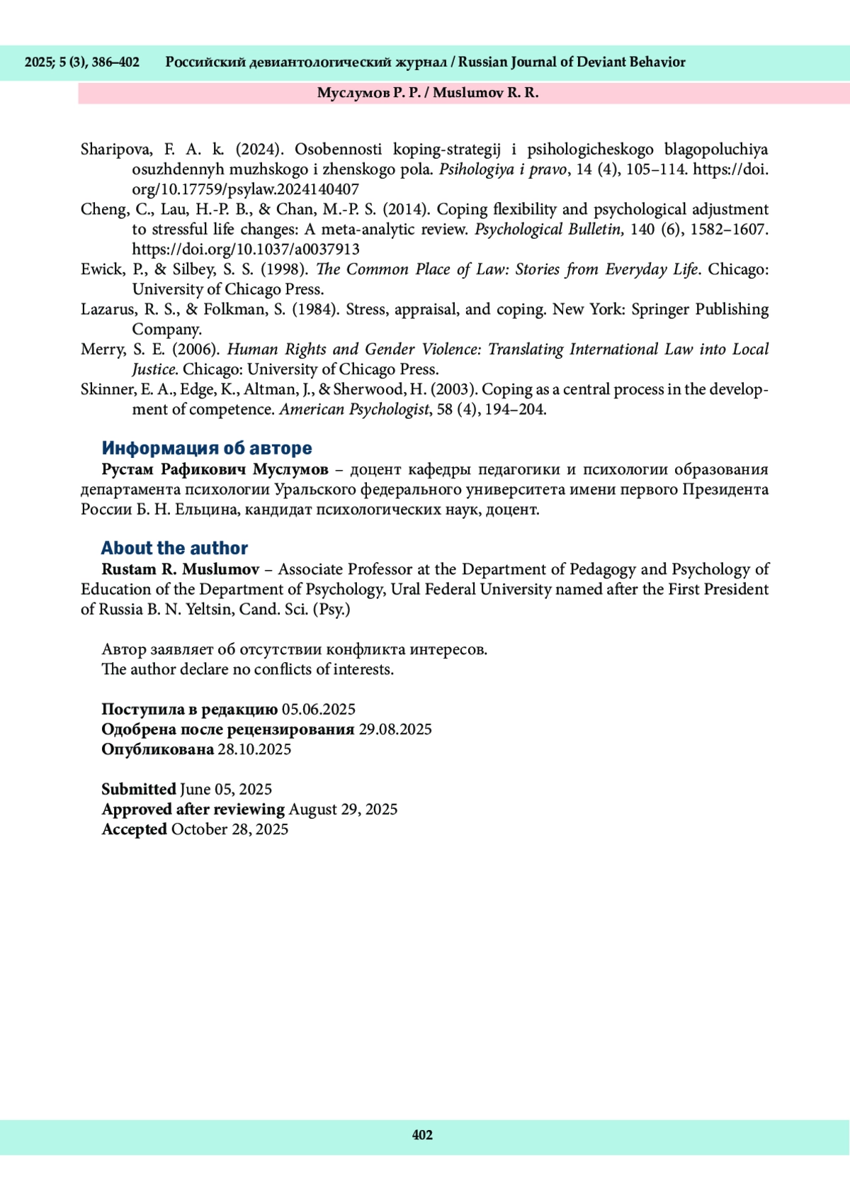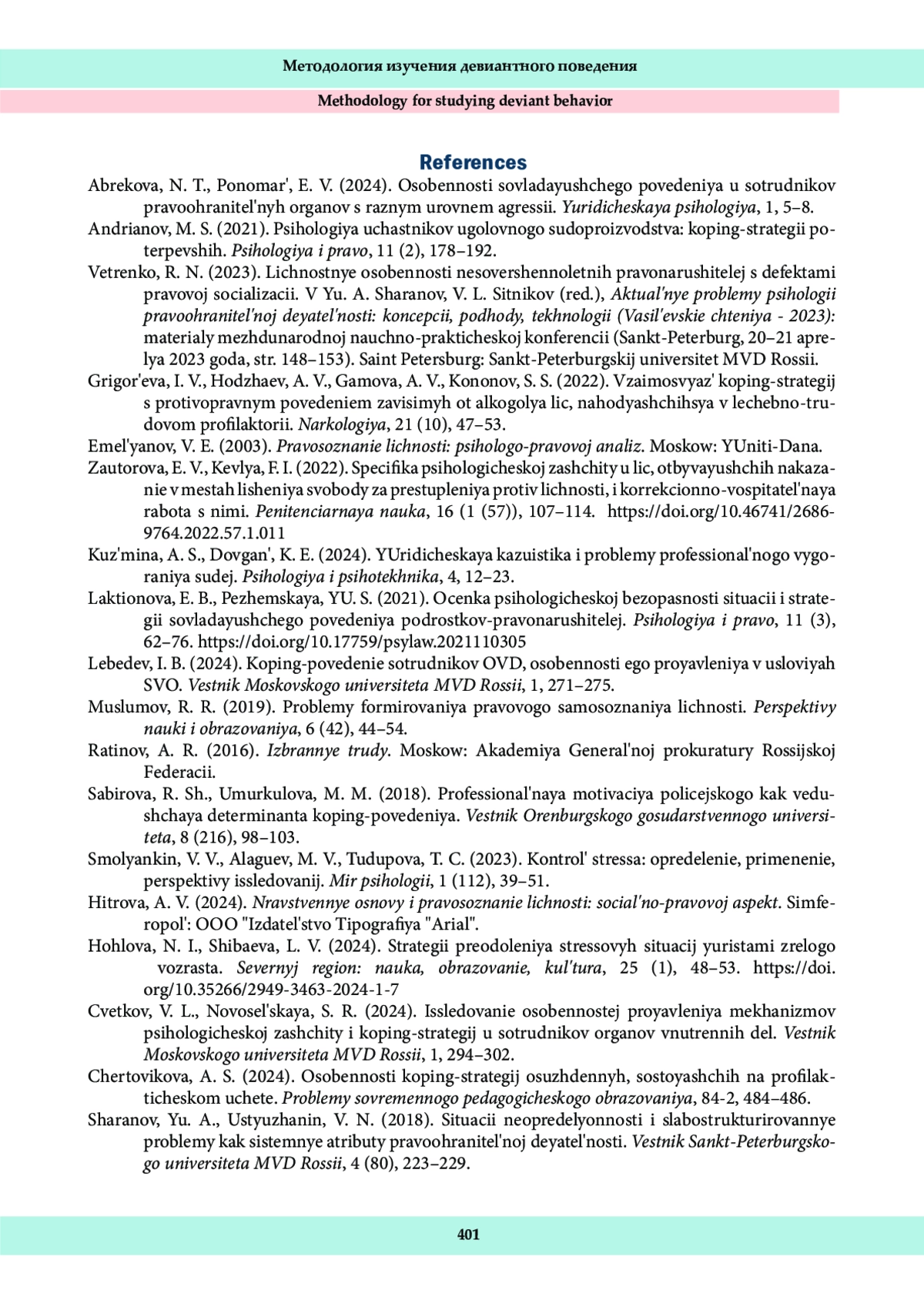 19. Шарипова, Ф. А. к. (2024). Особенности копинг-стратегий и психологического благополучия осужденных мужского и женского пола. Психология и право, 14 (4), 105-114. DOI: 10.17759/psylaw.2024140407