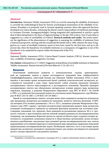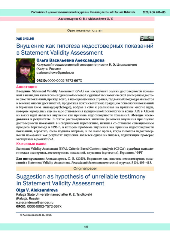 Statement Validity Assessment (SVA) как инструмент оценки достоверности показаний в наши дни является методической основой судебной психологической экспертизы достоверности показаний, прежде всего, в немецкоязычных странах, где данный подход развивается в течение многих десятилетий, продолжая почти столетнюю традицию психологии показаний в Германии (нем. Aussagepsychologie), вобрав в себя и реализовав на практике многие идеи, которые зародились еще на заре становления юридической психологии в конце XIX в. Одной из таких идей является внушение как причина недостоверности показаний. Методы исследования и результаты. В статье рассматривается значение феномена внушения при оценке достоверности показаний в исторической перспективе, начиная со ставшего сенсационным процесса Берхтольда в 1896 г., в котором проблема внушения как причина недостоверности показаний, вероятно, была поднята впервые, и по наше время, когда гипотеза недостоверности показаний как результат внушения является одной из гипотез, подлежащих проверке экспертами в рамках SVA.