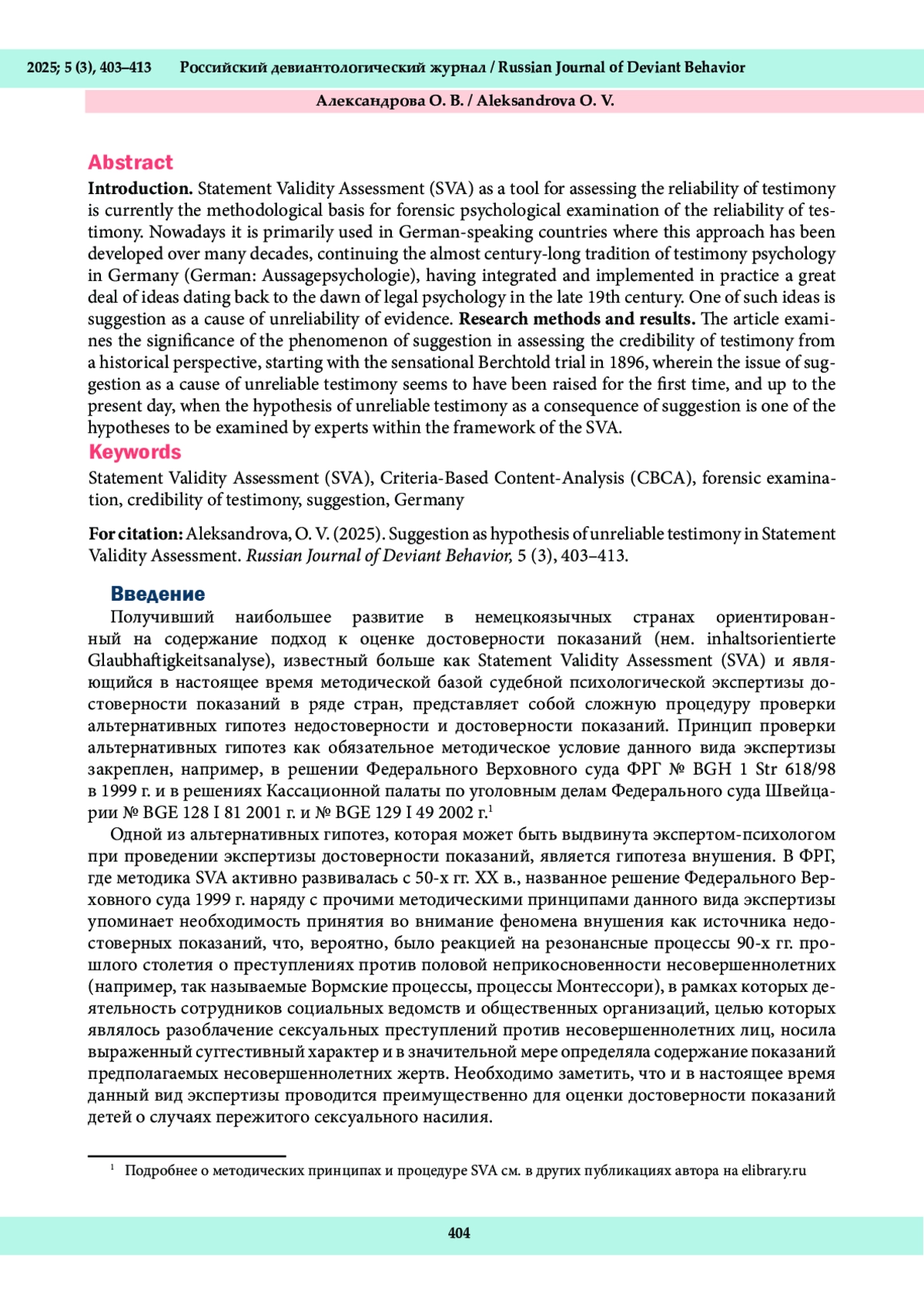 Получивший наибольшее развитие в немецкоязычных странах ориентированный на содержание подход к оценке достоверности показаний (нем. inhaltsorientierte Glaubhaftigkeitsanalyse), известный больше как Statement Validity Assessment (SVA) и являющийся в настоящее время методической базой судебной психологической экспертизы достоверности показаний в ряде стран, представляет собой сложную процедуру проверки альтернативных гипотез недостоверности и достоверности показаний. Принцип проверки альтернативных гипотез как обязательное методическое условие данного вида экспертизы закреплен, например, в решении Федерального Верховного суда ФРГ № BGH 1 Str 618/98 в 1999 г. и в решениях Кассационной палаты по уголовным делам Федерального суда Швейцарии № BGE 128 I 81 2001 г. и № BGE 129 I 49 2002 г.1