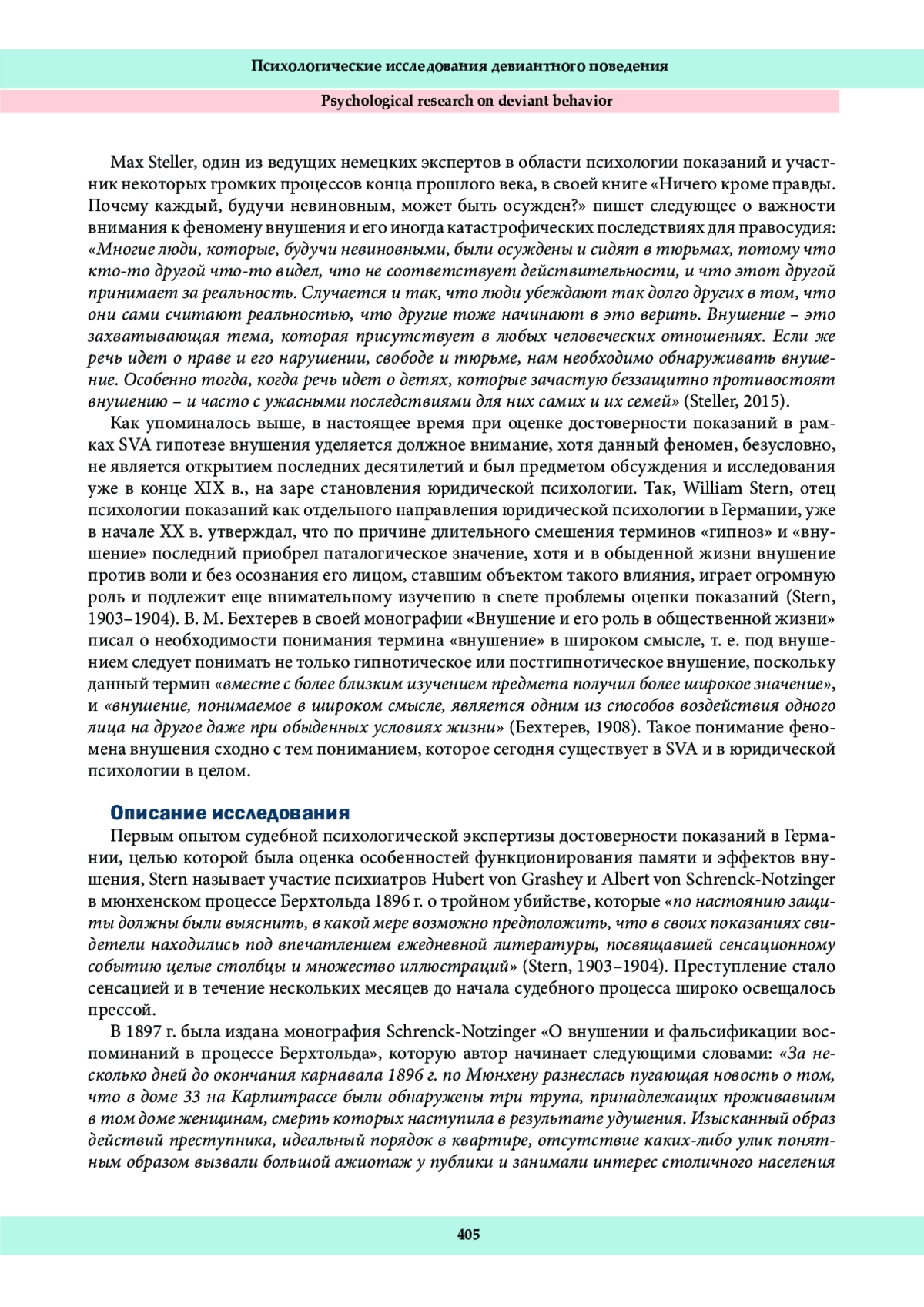 14. Schrenk-Notzinger, A. (1897). Über Suggestion und Erinnerungsfälschung im Berchtold-Process (Verhandlung wegen dreifachem Raubmord und Diebstahl vor dem oberbayerischen Schwur-gericht vom 1.-14. oct. 1896). Johann Ambrosius Barth. Leipzig.