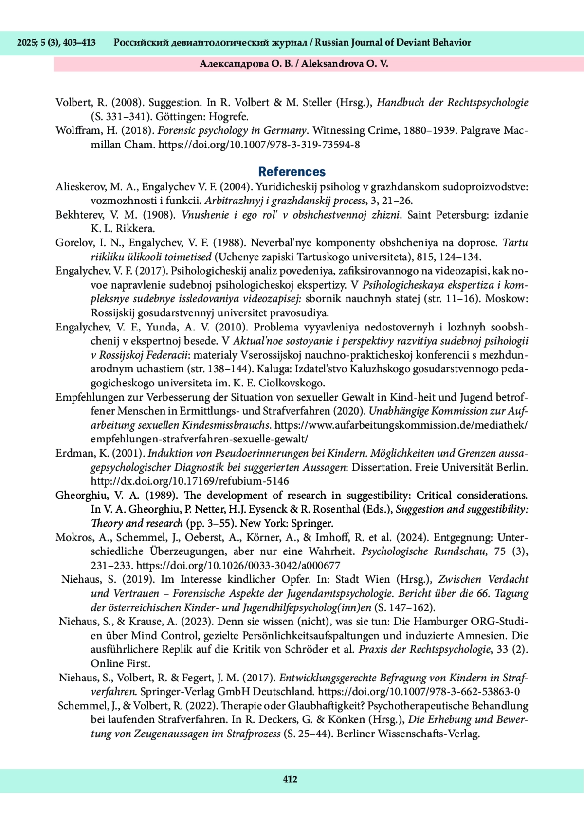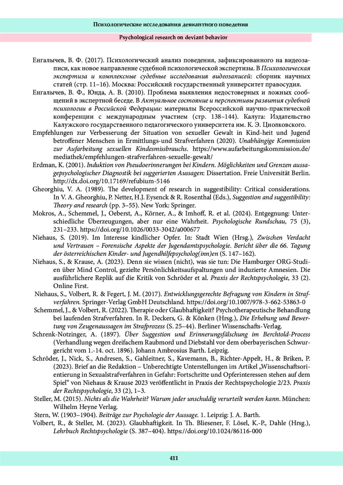 18. Volbert, R., & Steller, M. (2023). Glaubhaftigkeit. In Th. Bliesener, F. Lösel, K.-P., Dahle (Hrsg.), Lehrbuch Rechtspsychologie (S. 387-404). DOI: 10.1024/86116-000