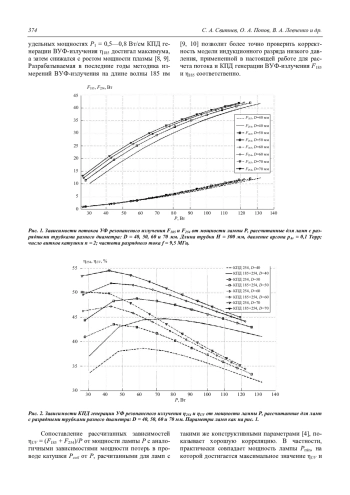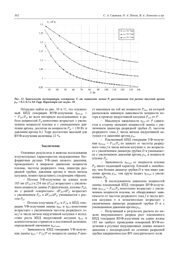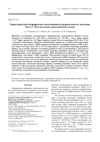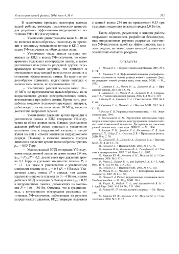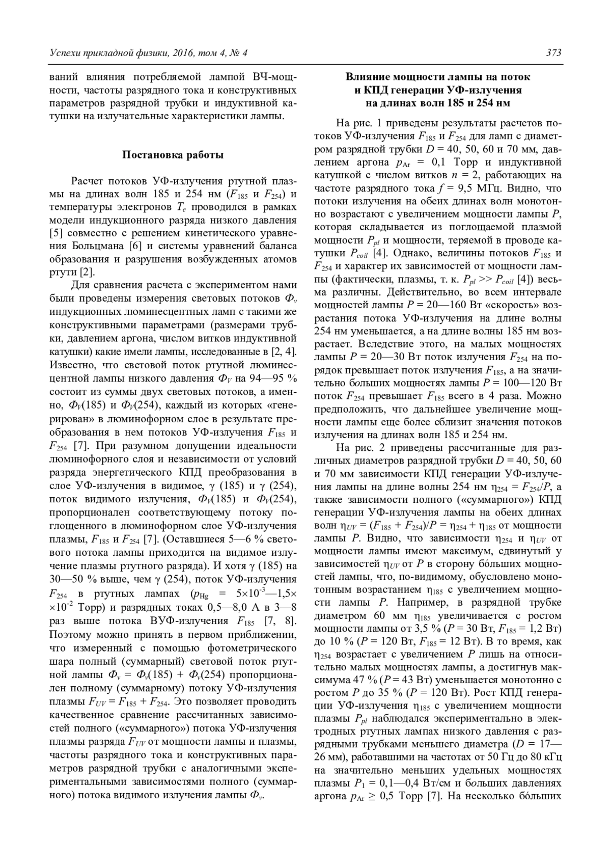 Проведено исследование излучательных характеристик индукционного разряда низкого давления на частотах 0,5—12,0 МГц и мощности 25—130 Вт в смеси паров ртути ( ≈ 10-2 Торр) и аргона (0,1—0,6 Торр) в трубках длиной 300 мм и диаметром 40, 50, 60 и 70 мм с помощью индуктивной катушки, охватывающей трубку по ее продольному периметру. Установлено, что потоки и КПД генерации резонансного ультрафиолетового (УФ) излучения лампы на длинах волн 185 и 254 нм возрастают с увеличением диаметра разрядной трубки, числа витков катушки и частоты разрядного тока и уменьшаются с увеличением давления аргона. Установлено, что влияние частоты разрядного тока на излучательные характеристики ламп проявляется «через» КПД индуктивной катушки ηcoil = 1–(Pcoil/P). Обнаружено, что поток и КПД генерации УФ-излучения плазмы на длине волны 185 нм возрастают с увеличением мощности плазмы. Зависимость КПД генерации УФ-излучения лампы на длине волны 254 нм от мощности лампы имеет максимум на той же мощности, на которой зависимость мощности потерь в проводе катушки Pcoil от мощности лампы имеет минимум. Увеличение диаметра трубки, частоты разрядного тока, числа витков катушки и давления аргона сдвигает положение максимума в сторону меньших мощностей лампы. Результаты расчета суммарного КПД генерации УФ-излучения ηUV = η185 + η254 качественно согласуются с результатами эксперимента.