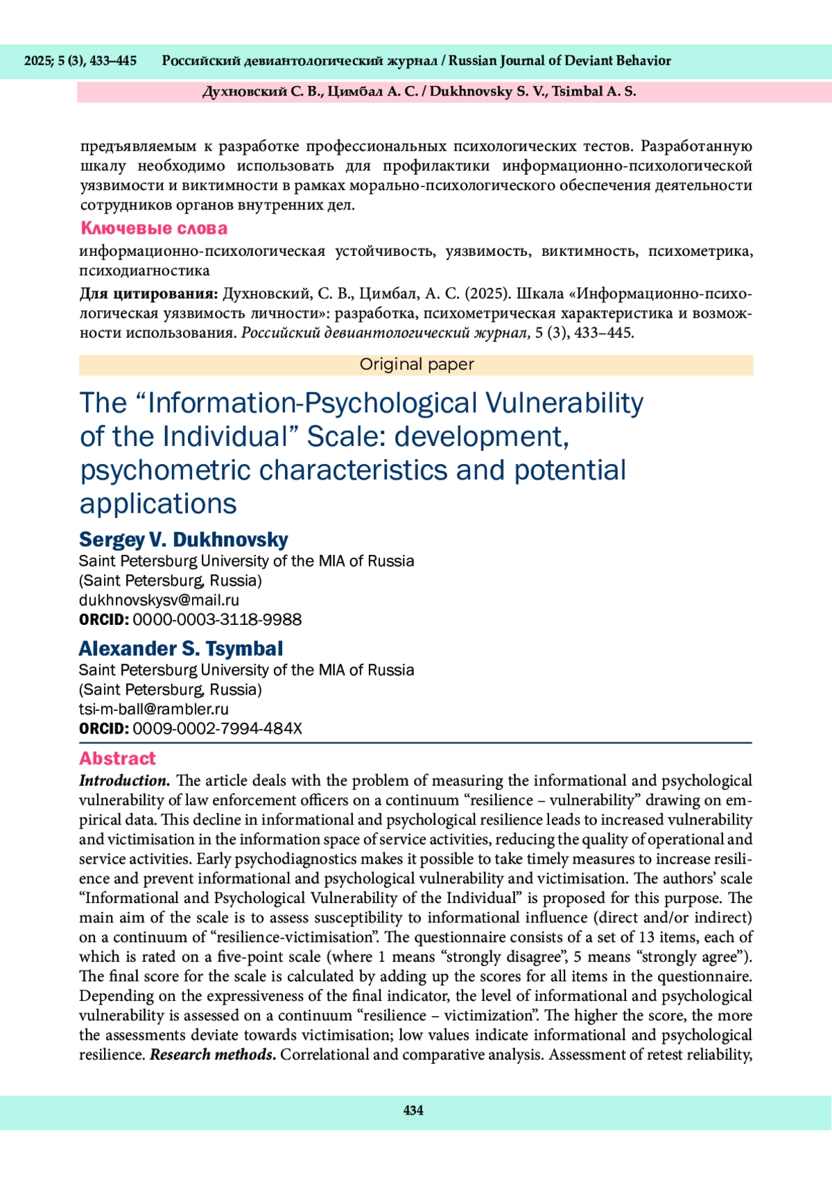 В статье с привлечением эмпирического материала раскрывается проблема измерения информационно-психологической уязвимости сотрудников органов внутренних дел в континууме «устойчивость – уязвимость». В информационном пространстве служебной деятельности снижение информационно-психологической устойчивости приводит к повышению уязвимости и виктимности, что негативно влияет на качество оперативно-служебной деятельности. Ранняя психодиагностика позволяет принять своевременные меры для повышения устойчивости и профилактики информационно-психологической уязвимости и виктимности. Для этого предлагается использовать авторскую шкалу «Информационно-психологическая уязвимость личности». Основное назначение шкалы – оценка подверженности влиянию информационного воздействия (прямого и / или косвенного) в континууме «устойчивость – виктимность». Опросник представляет собой набор из 13 пунктов, каждый из которых оценивается по пятибалльной шкале (где 1 – полностью не согласен, 5 – согласен полностью.). Итоговый балл по шкале вычисляется суммированием баллов по всем пунктам опросника. В зависимости от выраженности итогового показателя оценивается уровень информационно-психологической уязвимости в континууме «устойчивость – виктимность». Чем выше балл, тем больше оценки отклоняются в сторону виктимности, низкие значения говорят об информационно-психологической устойчивости. Методы исследования. Корреляционный и сравнительный анализ. Оценка ретестовой надежности, а также конструктной и критериальной валидности. Результаты. Шкала «Информационно-психологическая уязвимость личности» требует минимального времени для проведения и обработки и может применяться в различных ситуациях как с практическими, так и с исследовательскими целями. Представленная шкала отвечает основным психометрическим требованиям, предъявляемым к разработке профессиональных психологических тестов. Разработанную шкалу необходимо использовать для профилактики информационно-психологической уязвимости и виктимности в рамках морально-психологического обеспечения деятельности сотрудников органов внутренних дел.