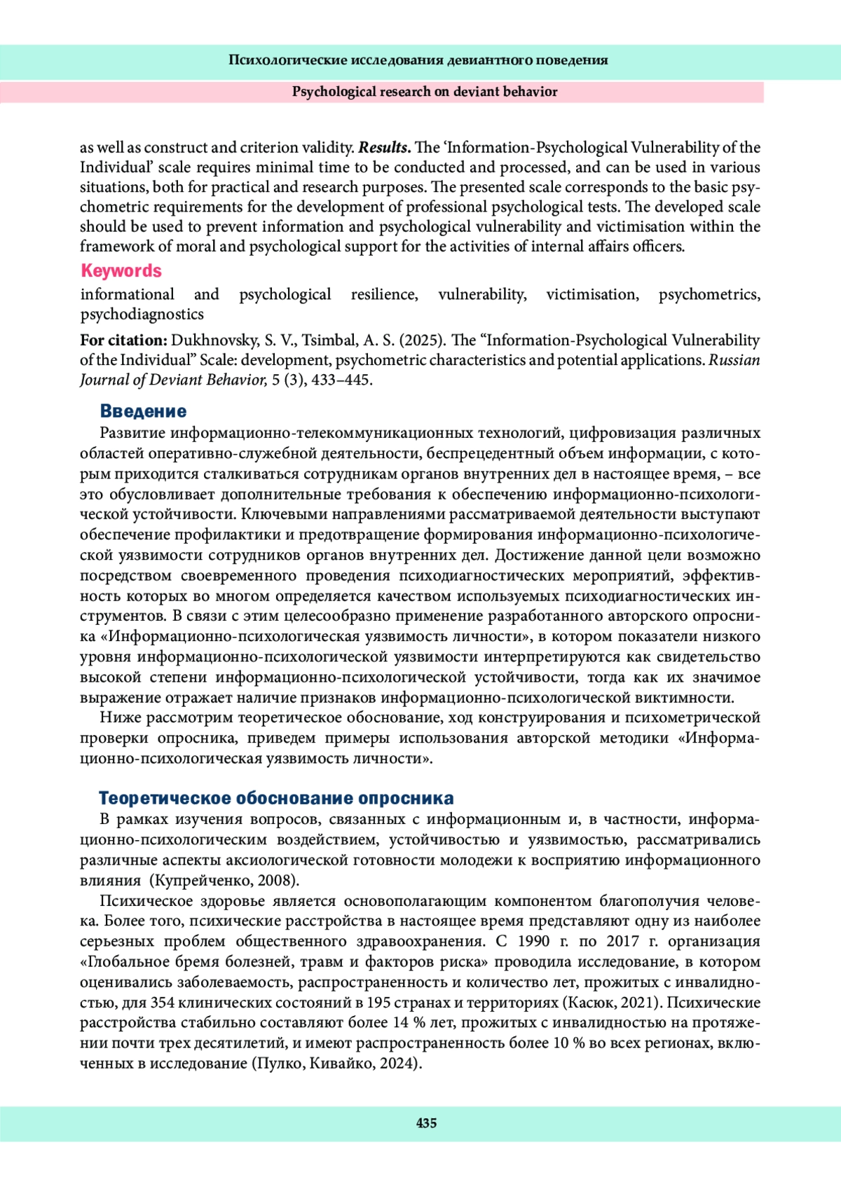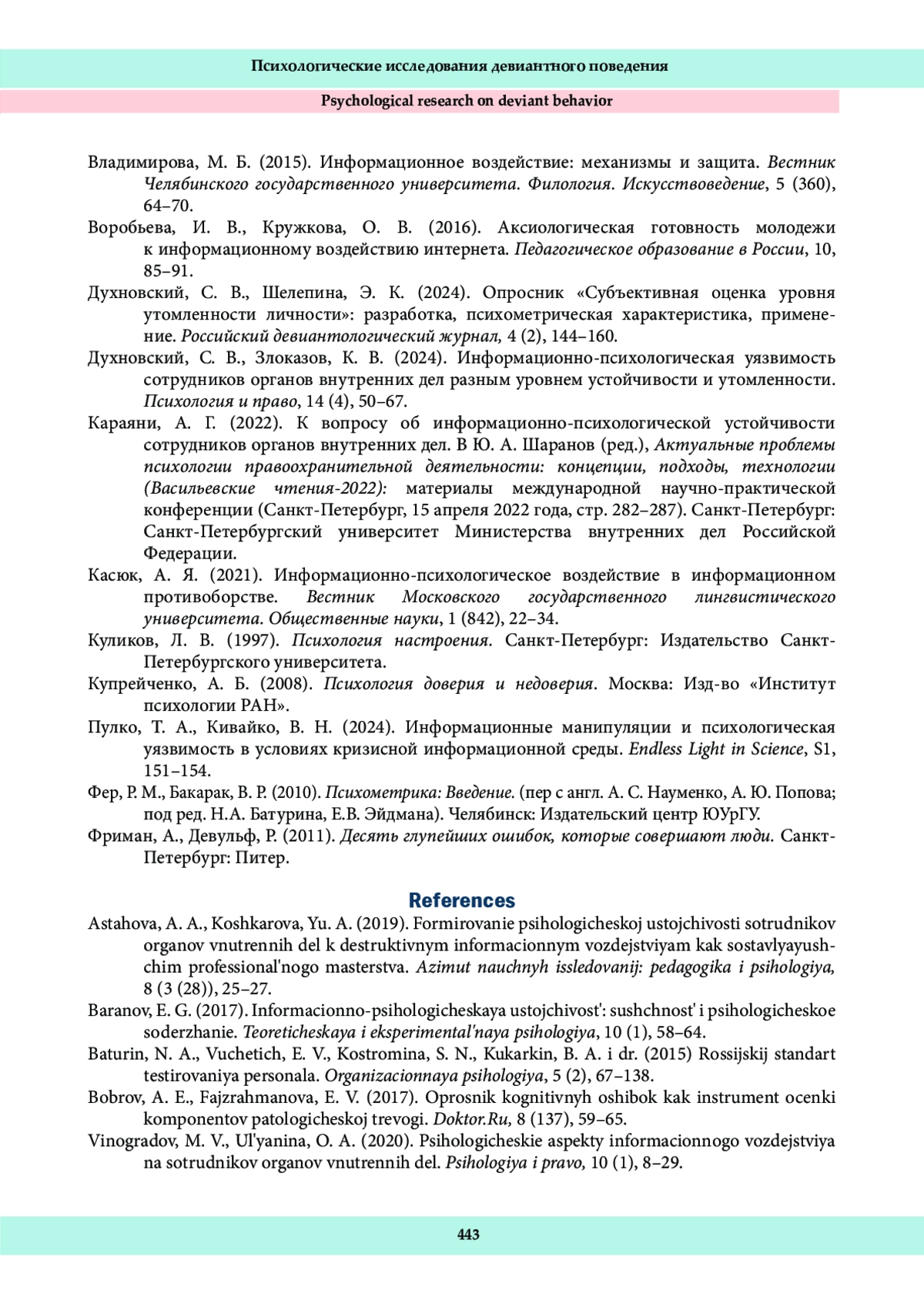 9. Духновский, С. В., Злоказов, К. В. (2024). Информационно-психологическая уязвимость сотрудников органов внутренних дел разным уровнем устойчивости и утомленности. Психология и право, 14 (4), 50-67.