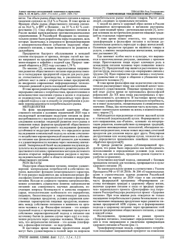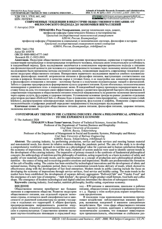 Цель исследования заключается в комплексном мировоззренческом подходе к питанию как физиологической ценности для человека и к удовлетворенности человека через экономику впечатлений. В ходе исследования были применены методы системного анализа, позволяющие выделить современные тенденции развития индустрии общественного питания. Императивом первичного исследования является симбиоз основополагающих философских понятий: антропологии питания и философии питании, выступающих соответственно как основа в вопросах безопасности и качества сырья и готовых блюд, и ее надстройка как концепция производства и философского отношения к питанию - источнику бытия и к получению положительных эмоций и впечатлений. Забота о здоровье предопределила формирование культа здорового питания. Кухня обогатилась технологическими инновациями и развитием этно- и национальных меню. В пандемийный период произошла переориентация на доставку блюд на дом, что показало свою эффективность наряду с развитием предприятий быстрого обслуживания. К современным тенденциям в общественном питании относится направленность на развитие экономики впечатлений через сервис-услуги, фуд-сервис и здоровое питание. Установлены основные тренды на рынке: развитие отдельных агрегаторов доставки «DeliveryClub» и «Яндекс Еда» и появление нового типа предприятия - «темная кухня» («dark kitchen»), распространение монопродуктовых мелких форматов, фуд-холлов и кофейнь. Появление современных технологических и цифровых решений определяет направленность последующих исследований.