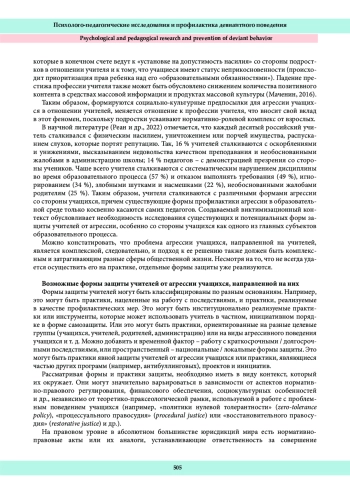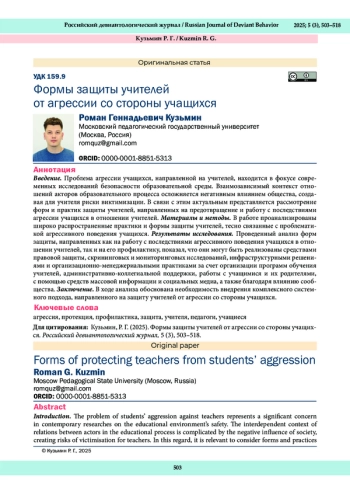 Проблема агрессии учащихся, направленной на учителей, находится в фокусе современных исследований безопасности образовательной среды. Взаимозависимый контекст отношений акторов образовательного процесса осложняется негативным влиянием общества, создавая для учителя риски виктимизации. В связи с этим актуальным представляется рассмотрение форм и практик защиты учителей, направленных на предотвращение и работу с последствиями агрессии учащихся в отношении учителей. Материалы и методы. В работе проанализированы широко распространенные практики и формы защиты учителей, тесно связанные с проблематикой агрессивного поведения учащихся. Результаты исследования. Проведенный анализ форм защиты, направленных как на работу с последствиями агрессивного поведения учащихся в отношении учителей, так и на его профилактику, показал, что они могут быть реализованы средствами правовой защиты, скрининговых и мониторинговых исследований, инфраструктурными решениями и организационно-менеджериальными практиками за счет организации программ обучения учителей, административно-коллегиальной поддержки, работы с учащимися и их родителями, с помощью средств массовой информации и социальных медиа, а также благодаря влиянию сообщества. Заключение. В ходе анализа обоснована необходимость внедрения комплексного системного подхода, направленного на защиту учителей от агрессии со стороны учащихся.
