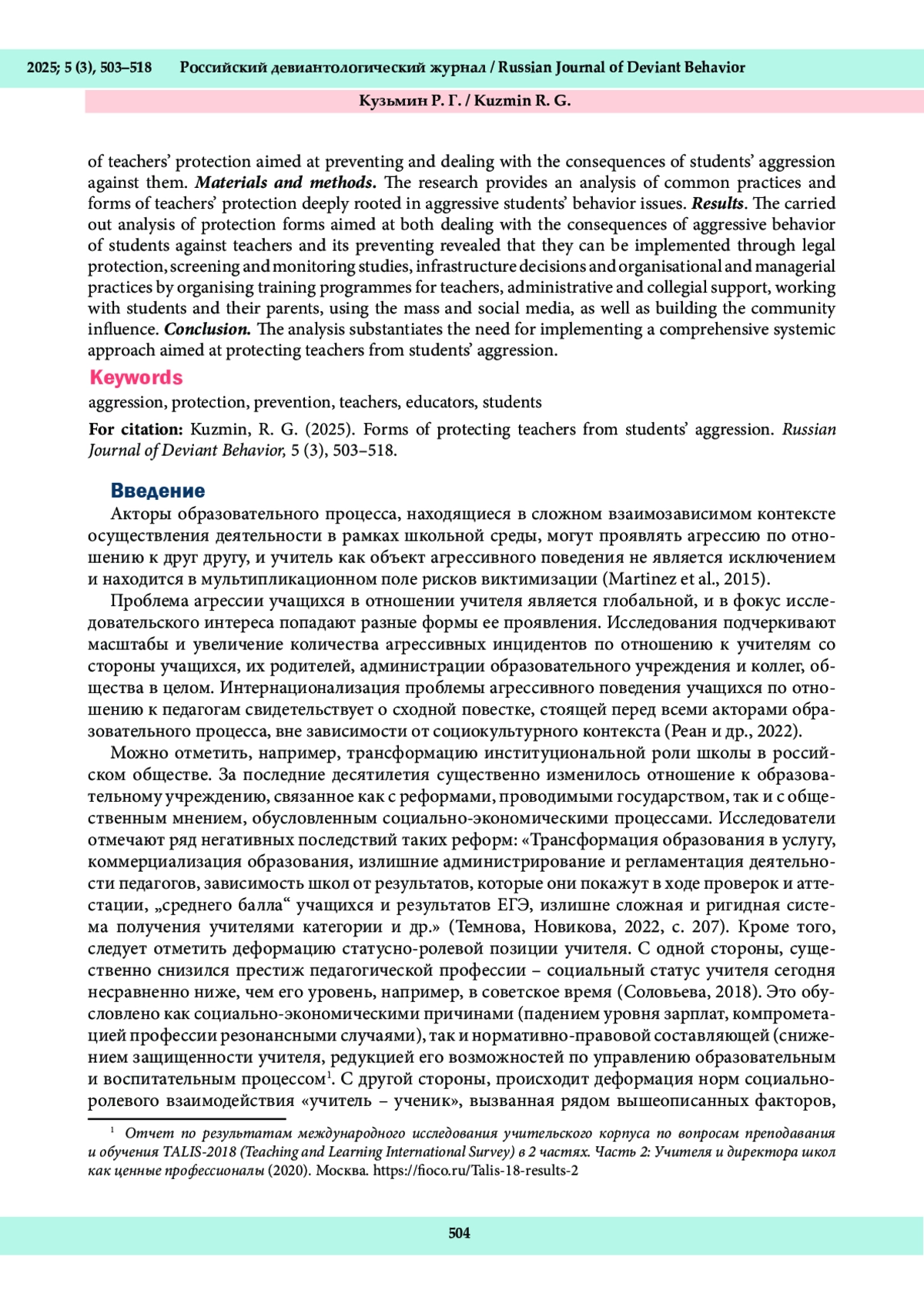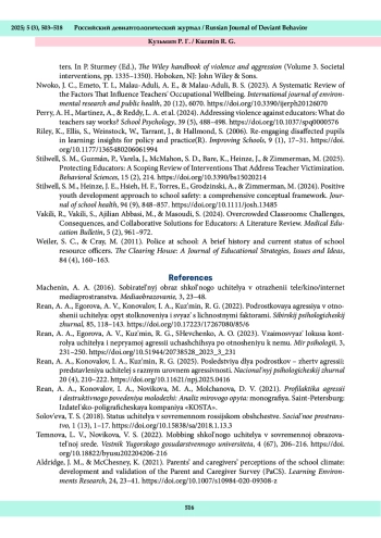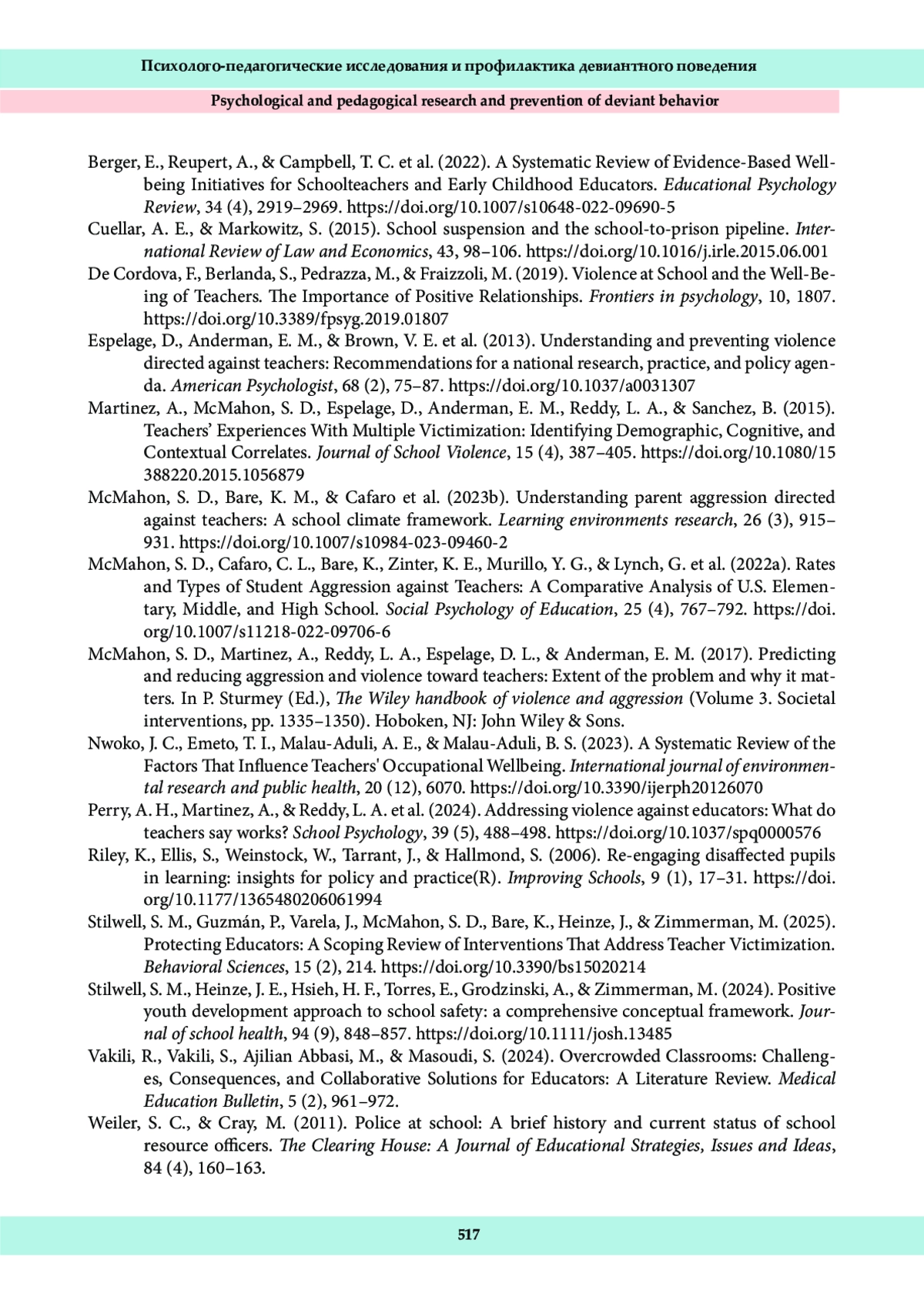 20. Stilwell, S. M., Guzmán, P., Varela, J., McMahon, S. D., Bare, K., Heinze, J., & Zimmerman, M. (2025). Protecting Educators: A Scoping Review of Interventions That Address Teacher Victimization. Behavioral Sciences, 15 (2), 214. DOI: 10.3390/bs15020214 EDN: MRRXBE
