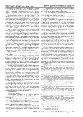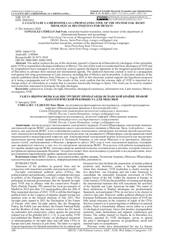 Автор исследует использование электронного журнала «Газета Иберосферы» идеологами националистической партии ВОКС для расширения своего идеологического влияния в Мексике. Цель этой работы — выяснить, как идеологам ВОКС и его сторонникам удалось использовать электронные источники против идеологических оппонентов в воображаемом геополитическом регионе так называемого «Иберосфера» для продвижения своей национальной и международной повестки дня. Анализируемый электронный журнал используется как инструмент пропаганды против левых правительств в Латинской Америке, в том числе Мексики и ее президента. Дискурсанализ статей, опубликованных о Мексике с февраля по август 2023 года в этом электронном журнале, подтверждает выдвинутую гипотезу о том, что это инструмент пропаганды ВОКС. Результаты этой работы подтверждают, что крайне правая партия ВОКС заинтересована во внешней политике колониализма в регионе, который считается исторически принадлежащим Испании. Эта работа может быть использована студентами и исследователями, интересующимися европейскими крайне правыми идеологиями.