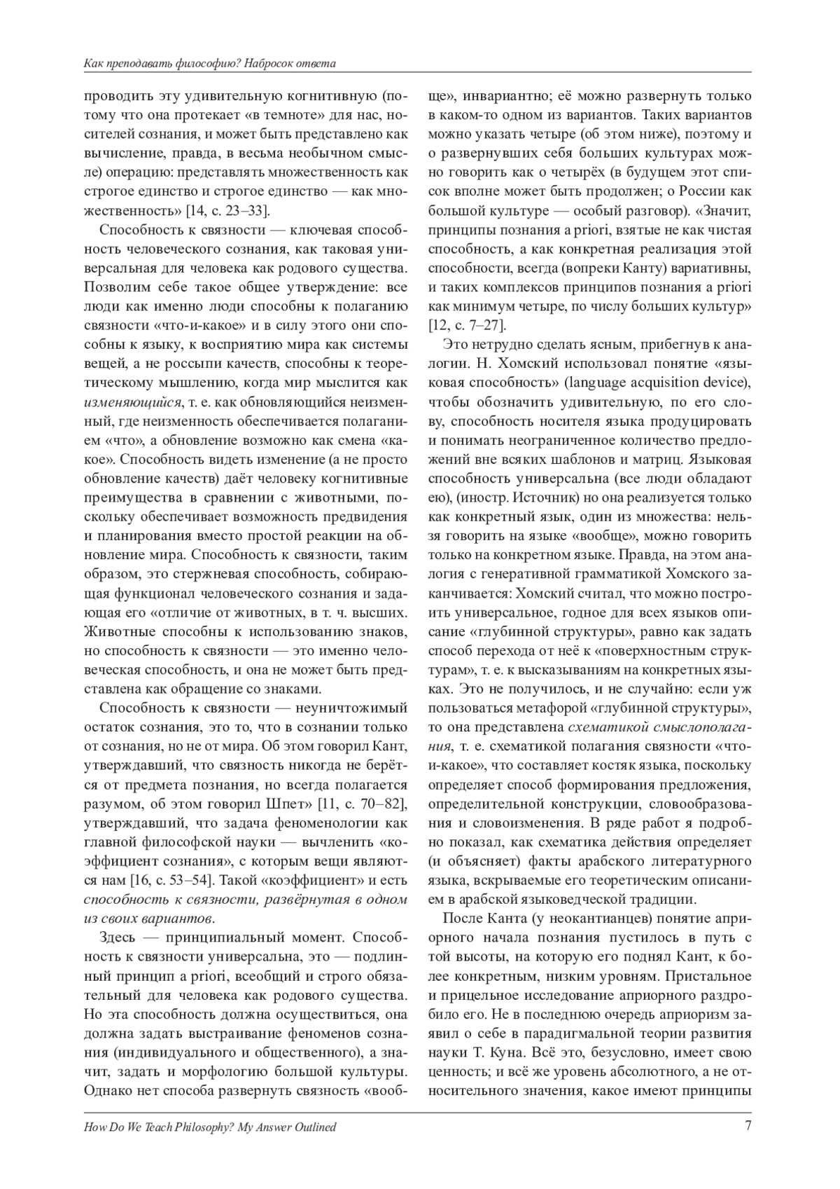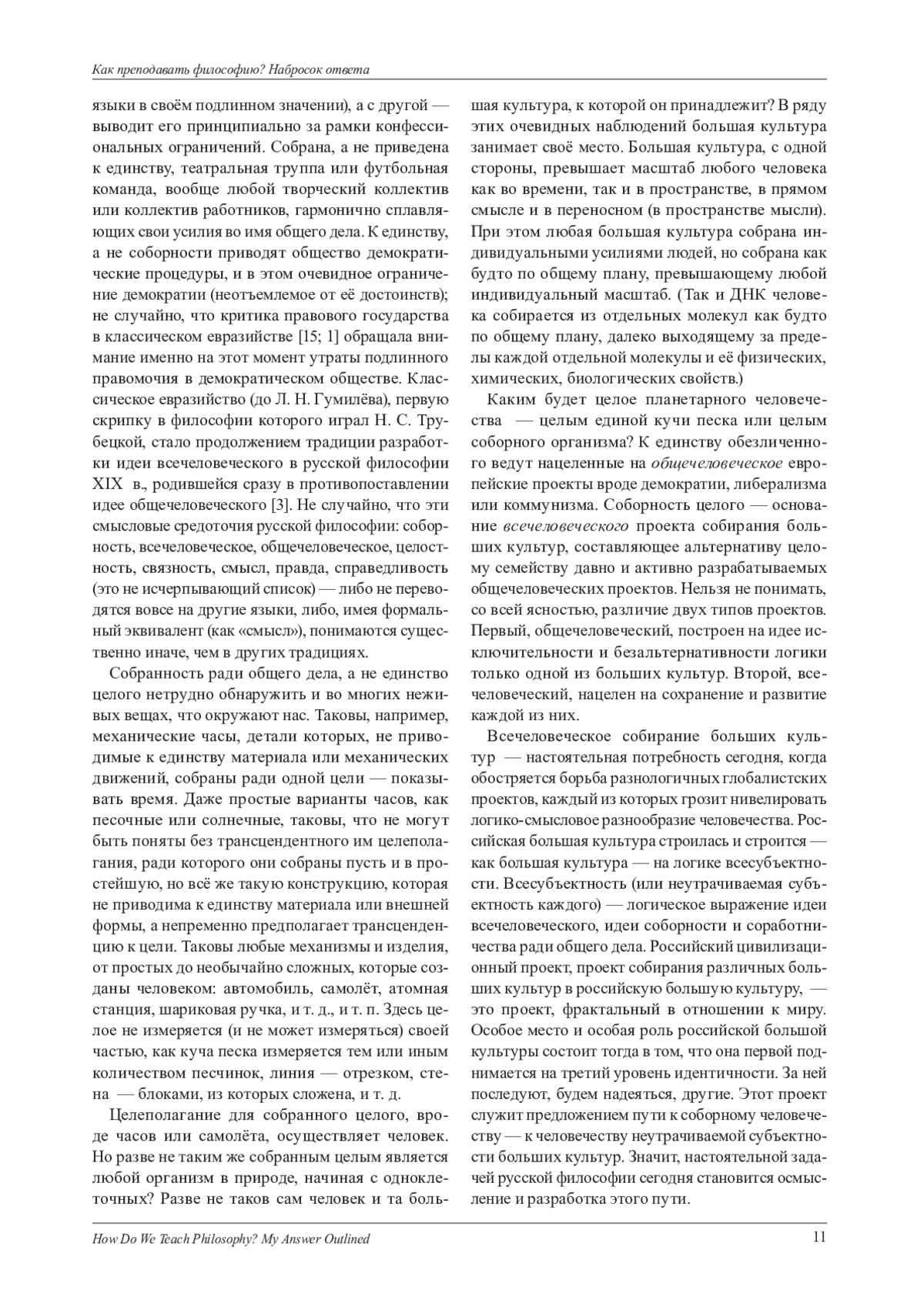 Преподавать философию - значит учить чему-то, что превышает простую сумму знаний об истории философских традиций, их архитектонике, их месте и роли в тех больших культурах, в лоне которых они получили развитие. Ответ на вопрос о том, что же именно превышает простую сумму знаний, зависит от того, как понимается философия. Отличие философии от науки заключается в том, что философия не может принять в качестве недоказываемой предпосылки парадигматику, задающую способ постановки и решения научных задач, включая определённую картину мира и онтологию. Основной задачей философии является критическая рефлексия, т. е. выяснение оправданности собственных оснований, а не только оснований любой теоретической или практической деятельности. Множественность независимых в своих основаниях философских традиций служит условием sine qua non выполнения философией своей ключевой задачи рефлексии собственных оснований (система базовых категорий и логика), поскольку такая задача не может быть выполнена в пределах одной философской традиции, неизбежно ограниченной как раз теми основаниями рациональности, которые ей надлежит критически рассмотреть. Типология больших культур обоснована типологией сознания, которая представлена как вариативная схематика полагания «что-и-какое». Предложено понимание роли российской большой культуры и её отличия от других больших культур.