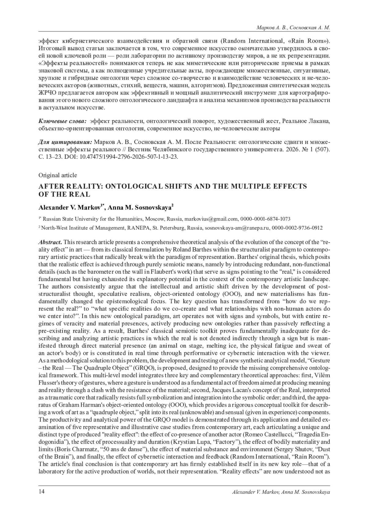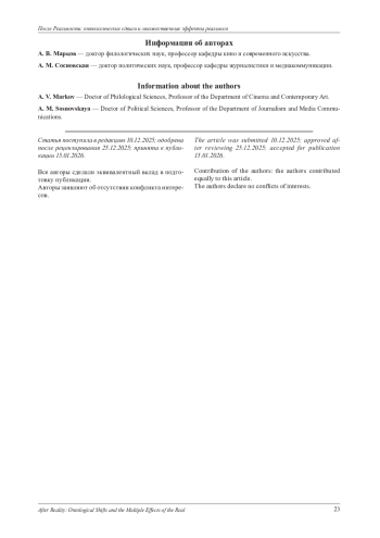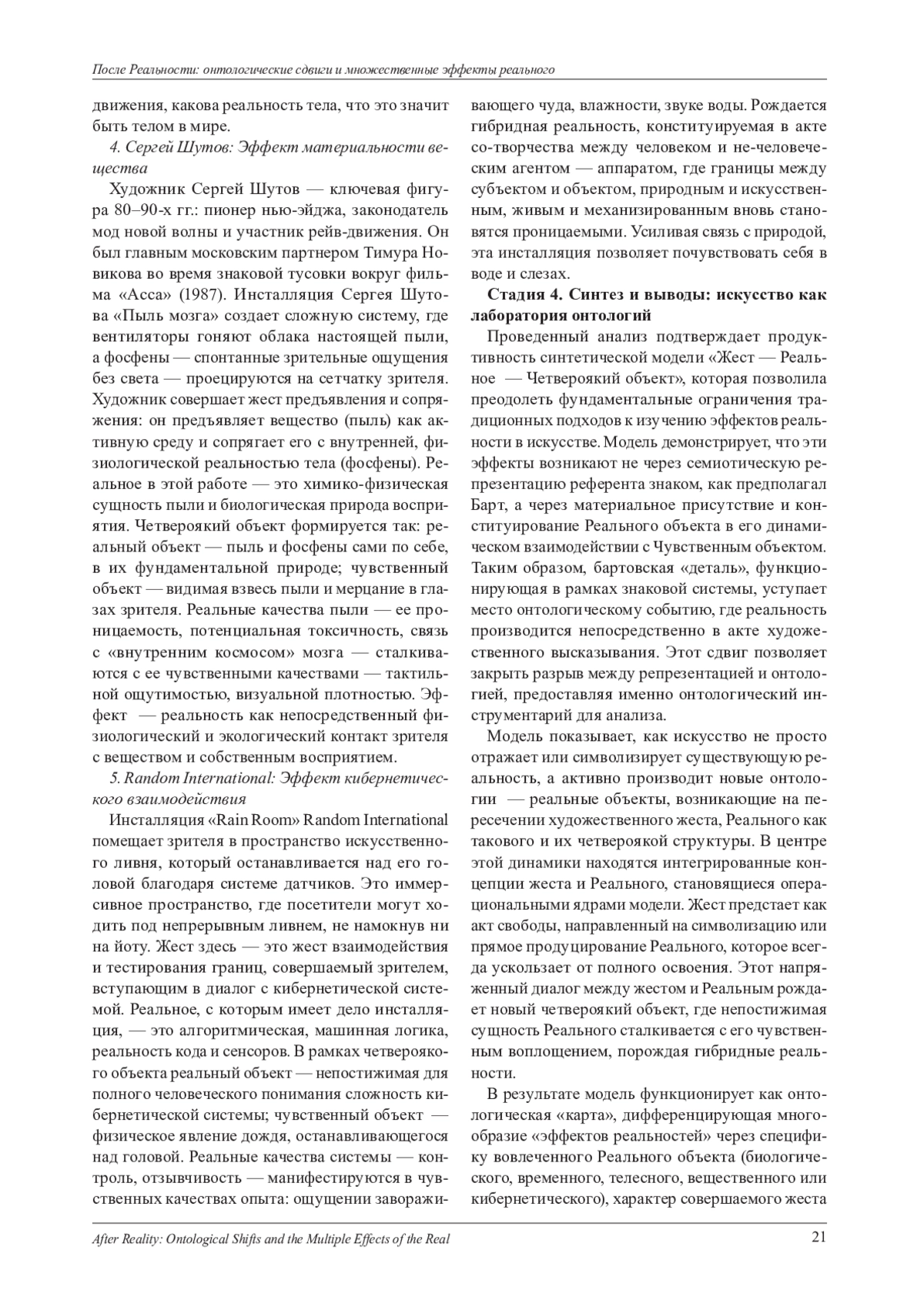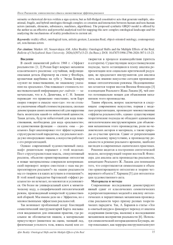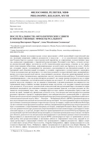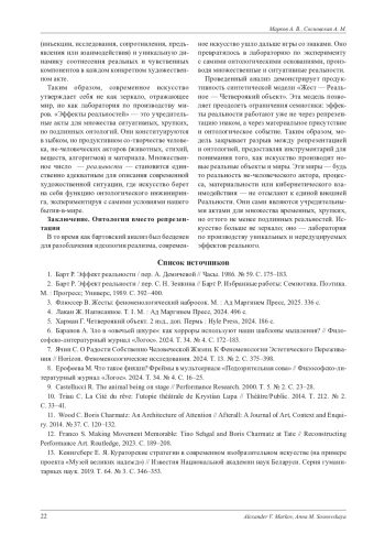 Данная исследовательская статья представляет собой масштабный теоретический анализ эволюции концепции «эффекта реальности» в искусстве - от ее классического формулирования Роланом Бартом в рамках структуралистской парадигмы до современных художественных практик, радикально порывающих с парадигмой репрезентации. Исходный тезис Барта, согласно которому реалистический эффект достигается сугубо семиотическими средствами, а именно за счет введения в повествование избыточных, нефункциональных деталей (таких как барометр на стене у Флобера), служащих знаком, указывающим на «реальное», рассматривается как фундаментальный, но исчерпавший свой объяснительный потенциал в условиях современного художественного ландшафта. Статья последовательно аргументирует, что интеллектуальный и художественный сдвиг, вызванный развитием постструктуралистской мысли, спекулятивного реализма, объектно-ориентированной онтологии (ООО) и новых материализмов, кардинально сместил эпистемологический фокус. Ключевой вопрос трансформировался с «как мы репрезентируем реальное?» на «какие именно реальности мы сотворяем и в какие отношения с нечеловеческими акторами мы вступаем?». В этой новой онтологической парадигме искусство оперирует уже не знаками и символами, а целыми режимами достоверности и материальными присутствиями, активно производя новые онтологии, а не пассивно отражая предзаданную реальность. В результате классический семиотический инструментарий Барта оказывается принципиально неадекватен для описания и анализа художественных практик, в которых реальное не обозначается опосредованно через знак, а манифестируется через прямое материальное присутствие (животное на сцене, тающий лед, физическая усталость и пот тела актера) или конституируется в режиме реального времени в процессе перформативного или кибернетического взаимодействия со зрителем. В качестве методологического решения данной проблемы предлагается разработка и апробация новой синтетической аналитической модели «Жест - Реальное - Четвероякий объект» (ЖРЧО), призванной предоставить недостающий комплексный онтологический инструментарий. Эта многоуровневая модель интегрирует три ключевых и взаимодополняющих теоретических подхода: во-первых, теорию жестов Вилема Флюссера, где жест понимается как фундаментальный акт свободы, направленный на производство смысла и реальности через столкновение с сопротивлением материала; во-вторых, концепцию Реального Жака Лакана, трактуемую как травматическое ядро, радикально сопротивляющееся полной символизации и интеграции в символический порядок; и, в-третьих, аппарат объектно-ориентированной онтологии (ООО) Грэма Хармана, предоставляющий строгий понятийный инструментарий для описания произведения искусства как «четвероякого объекта», расколотого на свои реальные (непознаваемые) и чувственные (данные в опыте) компоненты. Продуктивность и аналитическая сила модели ЖРЧО демонстрируется через ее применение и детальный разбор пяти репрезентативных и наглядных кейсов из современного искусства, каждый из которых артикулирует уникальный и distinct тип производимого «эффекта реальности»: эффект соприсутствия иного актора (Ромео Кастеллуччи, «Tragedia Endogonidia»), эффект процессуальности и длительности (Кристиан Люпа, 