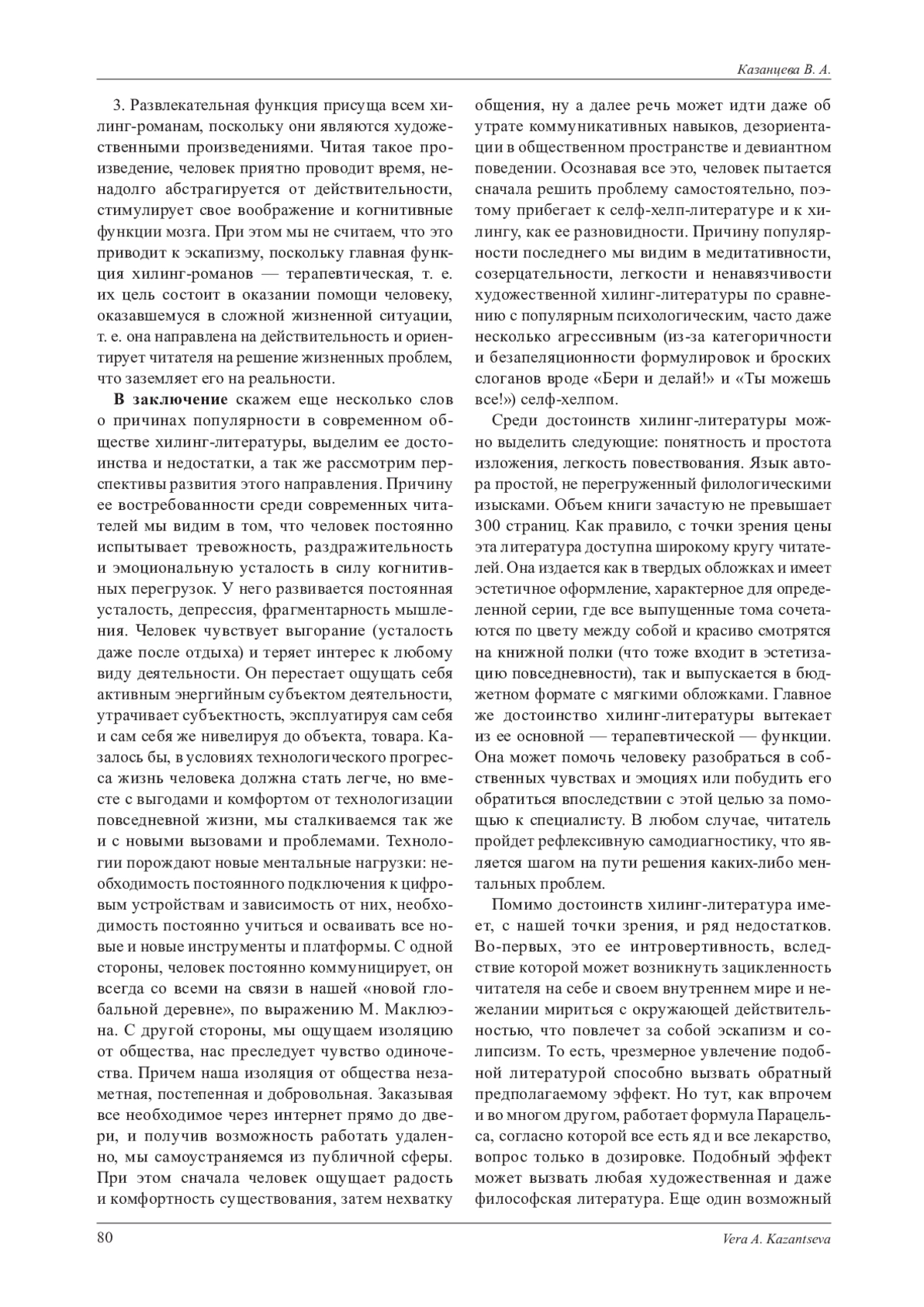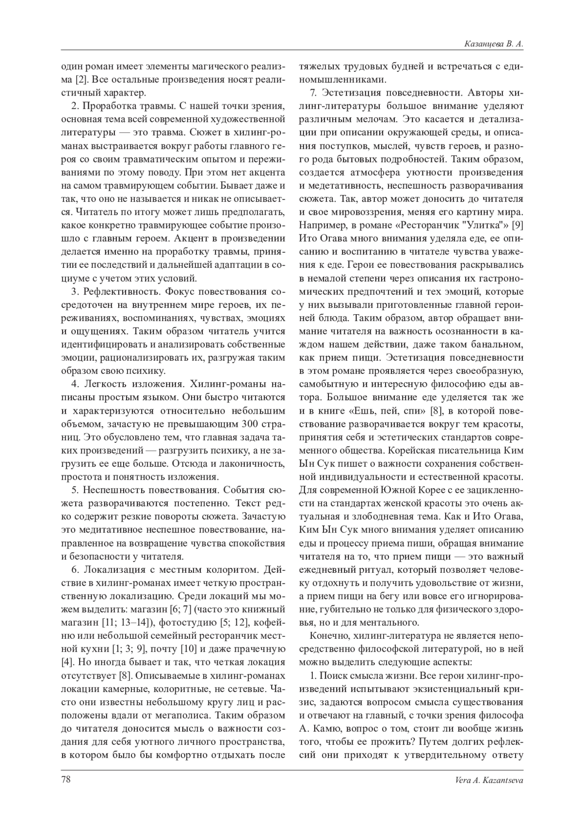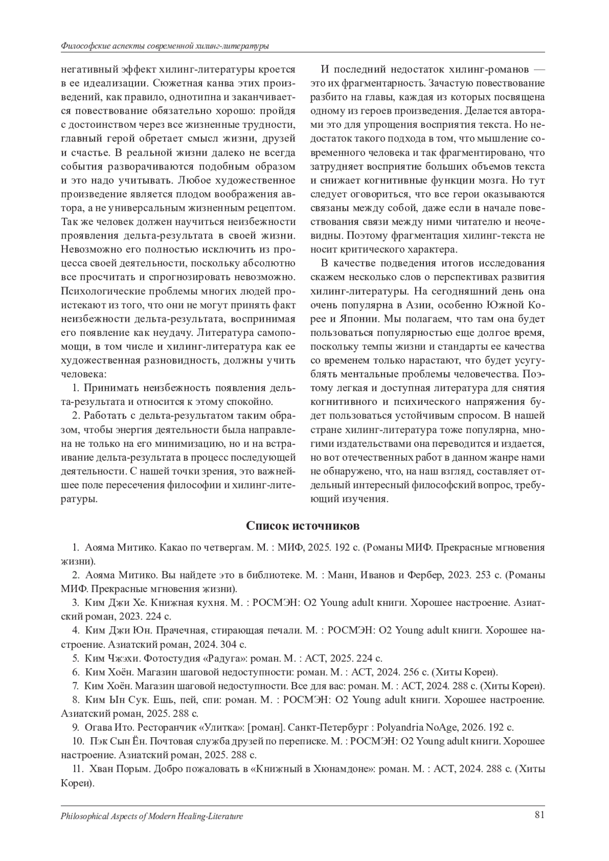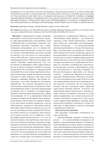 В статье рассматривается современная хилинг-литература, которая, появившись в Южной Корее и Японии, быстро завоевала популярность по всему миру. В нашей стране она активно издается и пользуется устойчиво высоким читательским спросом. В связи с этим мы посчитали актуальным изучить феномен популярности хилинг-литературы в современном обществе, а так же выяснить его особенности, философские основания и функции. С нашей точки зрения, хилинг-литература - это азиатская разновидность фил-гуд-литературы, которая, в свою очередь, входит в корпус литературы самопомощи, являясь ее художественным ответвлением. О философском селф-хелпе как проблеме современной философии мы писали ранее в отдельной статье. При этом данную статью считаем логическим продолжением нашего исследования современных вариаций литературы самопомощи. На сегодняшний день человек сталкивается с серьезными и зачастую опасными для его ментального здоровья когнитивными и эмоциональными перегрузками. Они приводят к выгоранию, депрессии, деструктивному поведению. Пытаясь решить эти проблемы, человек прибегает к различной литературе самопомощи. Хилинг-литература является ее художественной вариацией, которая выполняет терапевтическую, информационную и развлекательную функции. Простым языком и в небольшом объеме текста, авторы такой литературы предлагают различные способы справиться со стрессом, тревожностью, депрессией. Главной темой современной такой литературы является проработка травмы. С философией ее сближает то, что обе они учат читателя принимать наличие дельта-результата в своей жизни как неизбежное и не обязательно зло. Они учат работать с ним, то есть встраивать в процесс дальнейшей жизнедеятельности. Помимо этого, мы выделяем такие философские основания хилинг-литературы как поиск смысла жизни, открытость миру и борьба с одиночеством, работа с дельта-результатом и обретение счастья. В завершении статьи мы выделяем функции хилинг-литературы, ее достоинства и недостатки, а так же определяем проблемное поле для дальнейших исследований в этой области.