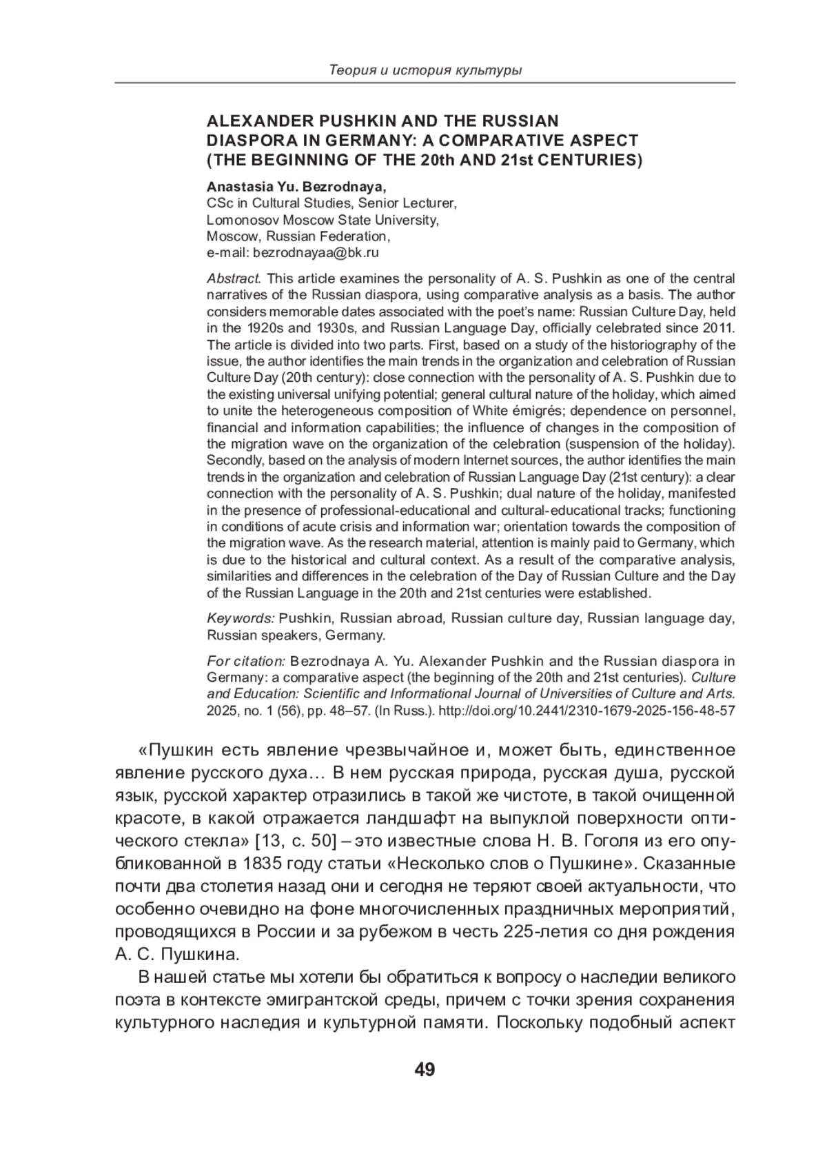 «Пушкин есть явление чрезвычайное и, может быть, единственное явление русского духа… В нем русская природа, русская душа, русской язык, русской характер отразились в такой же чистоте, в такой очищенной красоте, в какой отражается ландшафт на выпуклой поверхности оптического стекла» [13, c. 50] – это известные слова Н. В. Гоголя из его опубликованной в 1835 году статьи «Несколько слов о Пушкине».