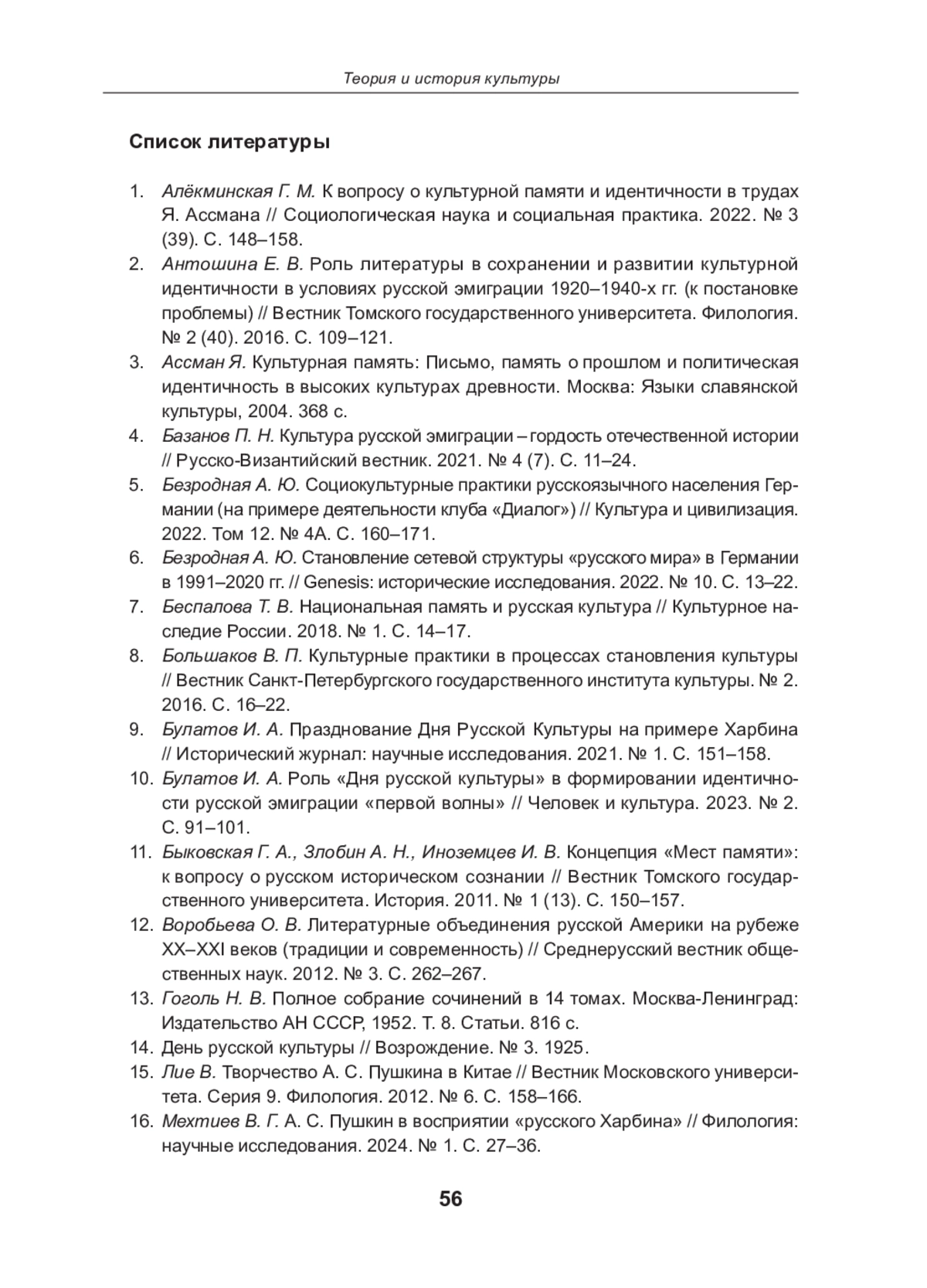 1. Алёкминская Г. М. К вопросу о культурной памяти и идентичности в трудах Я. Ассмана // Социологическая наука и социальная практика. 2022. № 3 (39). С. 148-158. EDN: QNUVUY