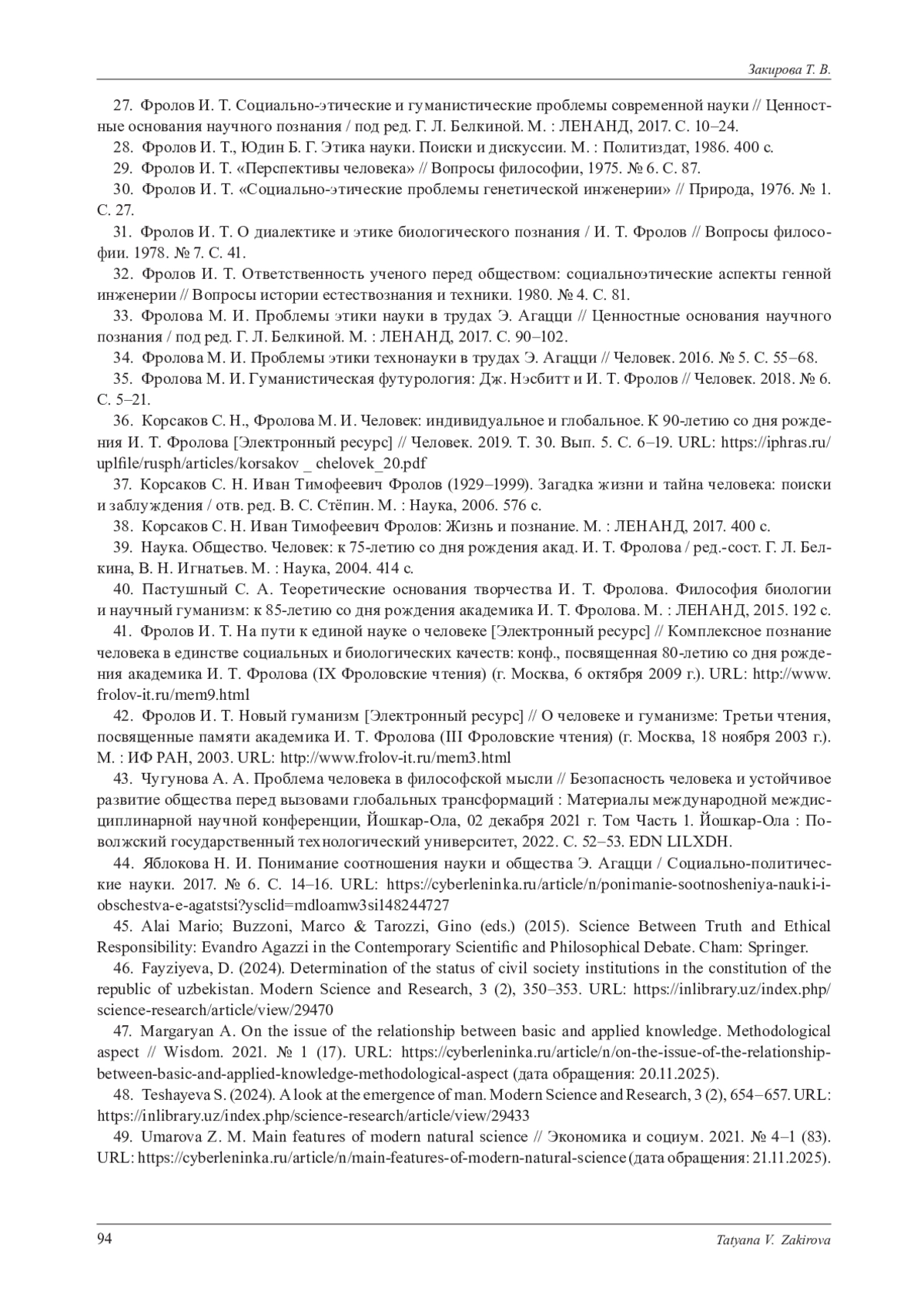27. Фролов И. Т. Социально-этические и гуманистические проблемы современной науки // Ценностные основания научного познания / под ред. Г. Л. Белкиной. М. : ЛЕНАНД, 2017. С. 10-24.