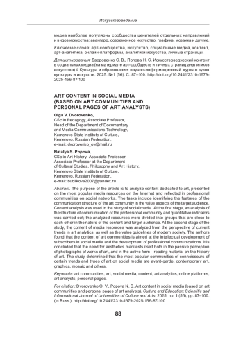 Целью статьи является анализ контента, посвященного искусству, представленному в наиболее популярных медиаресурсах сети интернет и отраженных в профессиональных сообществах в социальных сетях. В число задач входит выявление особенностей коммуникационной структуры арт сообщества и ценностные аспекты целевой аудитории. При исследовании социальных медиа использован контент анализ. На первом этапе проведен анализ структуры коммуникации профессионального сообщества, количественных показателей; анализируемые ресурсы разделены на группы, близкие друг другу по характеру контента и целевой аудитории. На втором этапе исследования контент медиаресурсов проанализирован с позиции актуальных тенденций арт аналитики, а так же ценностных ориентиров современного общества. Авторами установлено, что контент арт сообществ направлен на интеллектуальное развитие подписчиков в социальных медиа, развитие профессиональных коммуникаций. Сделаны выводы, что потребность в эстетике проявляется как в пассивном восприятии фотографий произведений искусства, так и в активной форме чтении материала по истории искусства. В ходе исследования определено, что в социальных медиа наиболее популярны сообщества ценителей отдельных направлений и видов искусства: авангард, современное искусство, графика, мозаика и другие.