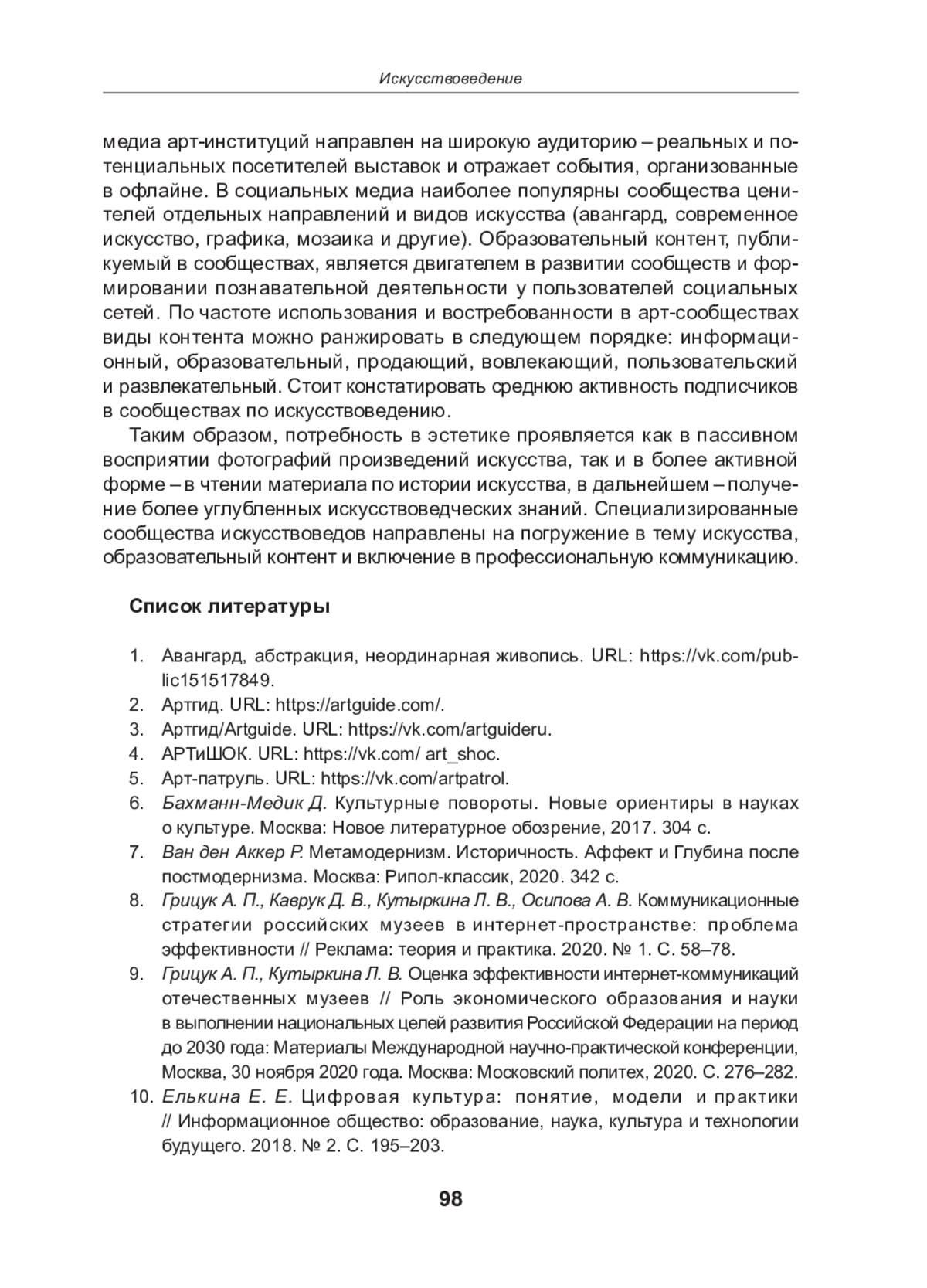 9. Грицук А. П., Кутыркина Л. В. Оценка эффективности интернет коммуникаций отечественных музеев // Роль экономического образования и науки в выполнении национальных целей развития Российской Федерации на период до 2030 года: Материалы Международной научно практической конференции, Москва, 30 ноября 2020 года. Москва: Московский политех, 2020. С. 276-282. EDN: HTXIOG