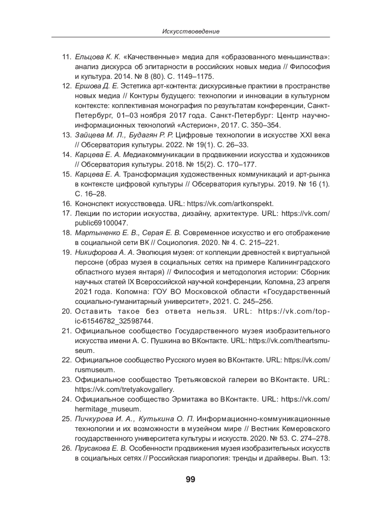 18. Мартыненко Е. В., Серая Е. В. Современное искусство и его отображение в социальной сети ВК // Социология. 2020. № 4. С. 215-221.