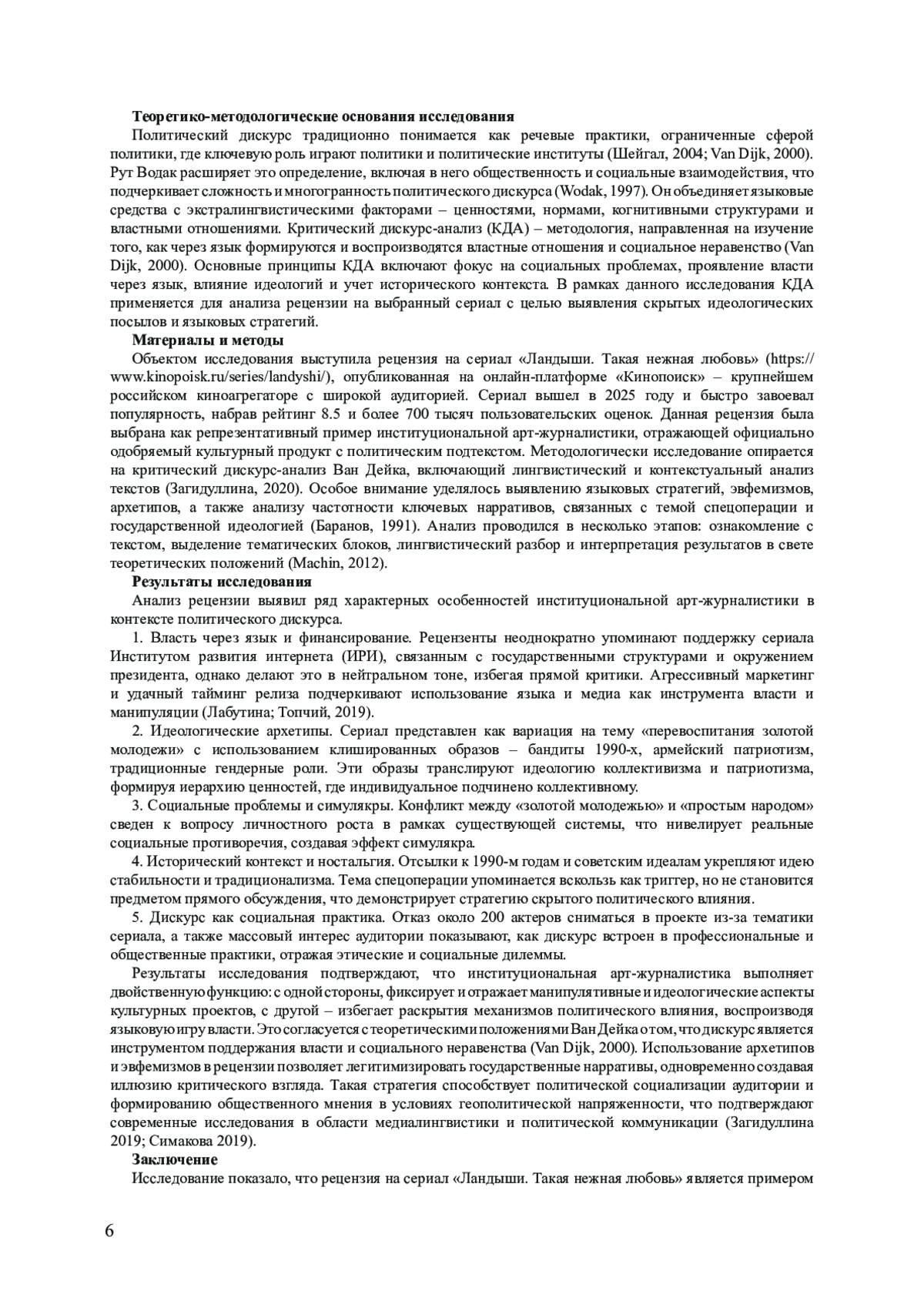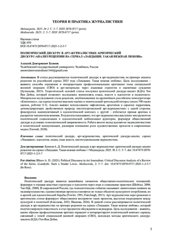 В статье рассматривается политический дискурс в арт-журналистике на примере анализа рецензии на российский сериал 2025 года «Ландыши. Такая нежная любовь». Цель исследования - выявить способы отражения и интерпретации профессиональными критиками темы специальной военной операции (СВО) в арт-материалах через языковые стратегии и оценочные суждения (Кузнецова, 2023). Теоретической основой статьи послужил критический дискурс-анализ (КДА) Тен Ван Дейка, который позволяет исследовать взаимосвязь языка, власти и идеологии в медиатексте. Материалом исследования стала рецензия, опубликованная на крупнейшем российском киноагрегаторе«Кинопоиск», где сериал получил высокие оценки и значительный зрительский интерес (около 700 тысяч оценок, рейтинг 8.5). Анализ выявил использование эвфемизмов, архетипов и скрытых нарративов, демонстрирующих двойственную природу институциональной арт-журналистики: с одной стороны, фиксируется манипулятивный и идеологический контекст, с другой - избегается прямая критика и раскрытие механизмов влияния. Результаты показывают, что арт-журналистика выступает инструментом политической социализации и идеологической мобилизации аудитории, формируя общественный дискурс в условиях геополитической напряженности. Работа вносит вклад в развитие медиалингвистики и политической коммуникации, расширяя понимание роли художественных проектов в современных медиа (Топчий, 2020).