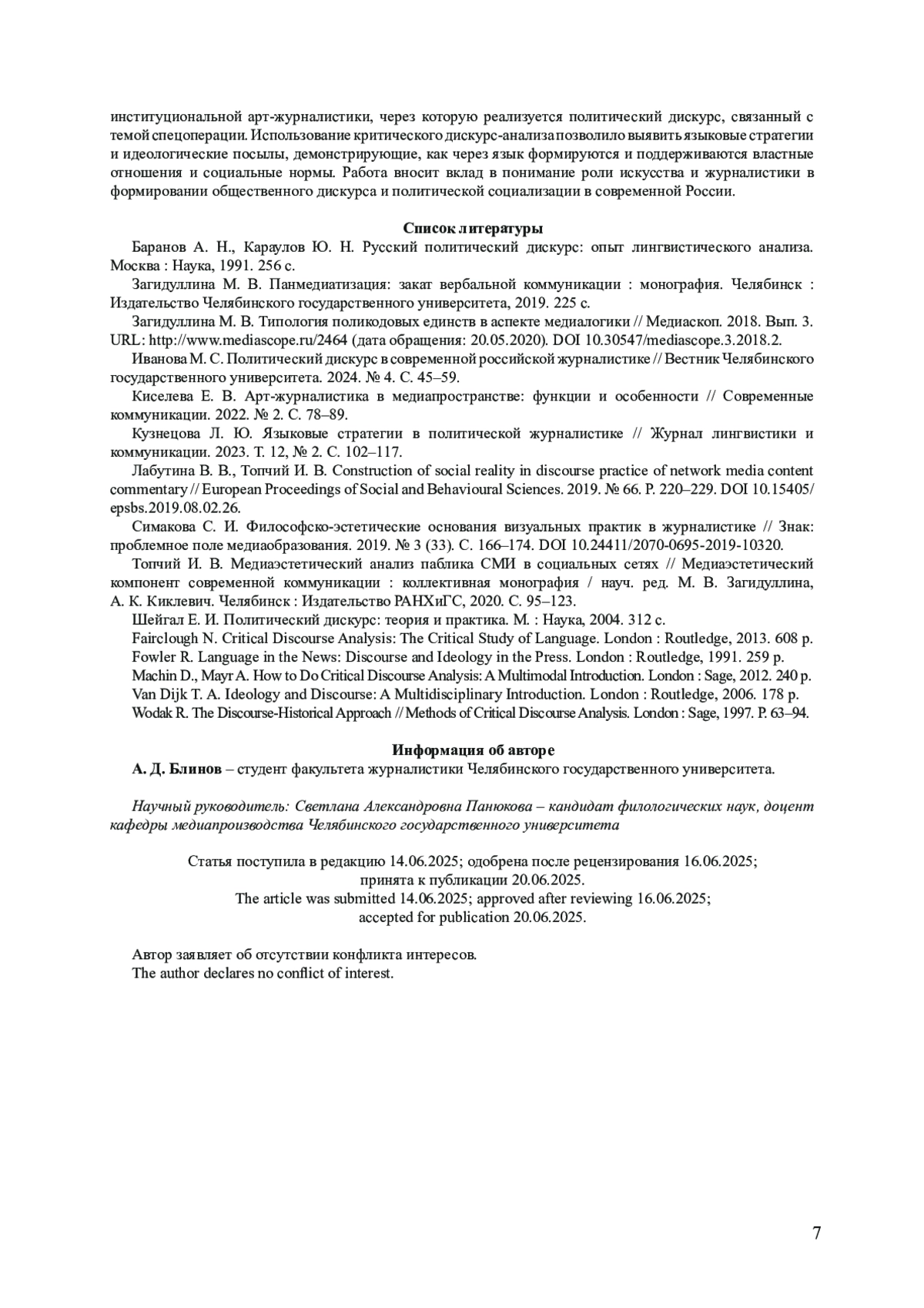 4. Иванова М. С. Политический дискурс в современной российской журналистике // Вестник Челябинского государственного университета. 2024. № 4. С. 45-59.