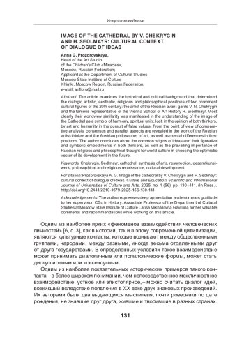 В статье рассматриваются историко-культурные предпосылки, определившие диалогичность художественно эстетических и религиозно философских позиций двух выдающихся деятелей культуры XX века: художника русского авангарда В. Н. Чекрыгина и известного представителя Венской школы искусствознания Х. Зедльмайра. Наиболее явно их мировоззренческое сходство проявилось в понимании образа Собора как символа гармонии, духовного единства, утерянных, по мнению обоих мыслителей, искусством и человечеством в погоне за ложными ценностями. С точки зрения компаративного подхода выявляются консенсусные и параллельные аспекты в творчестве русского художника мыслителя и австрийского философа искусства, а также ментальные различия в их позициях. Автор делает вывод об общности истоков идей и их образно символических воплощений у обоих мыслителей, а также о превалирующем значении русской религиозно философской мысли для мировой культуры в выборе оптимистического вектора ее развития в будущем.