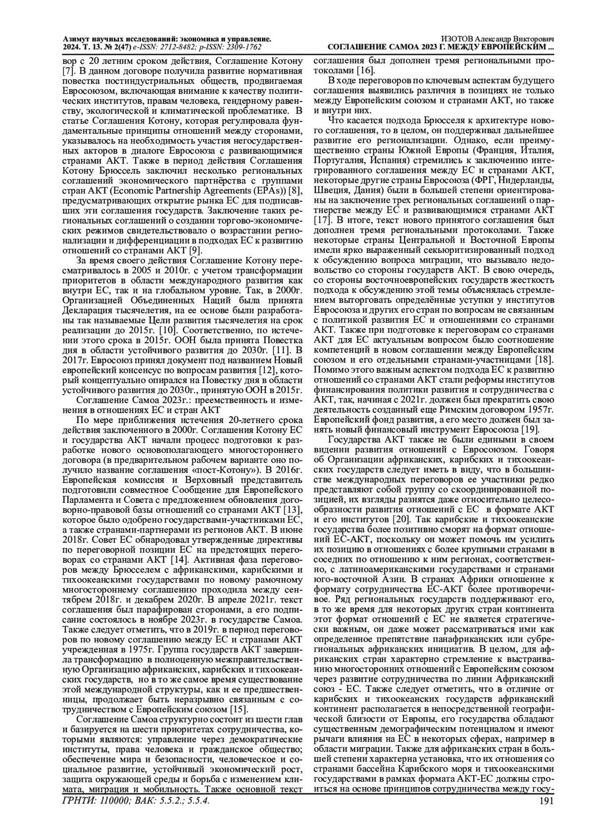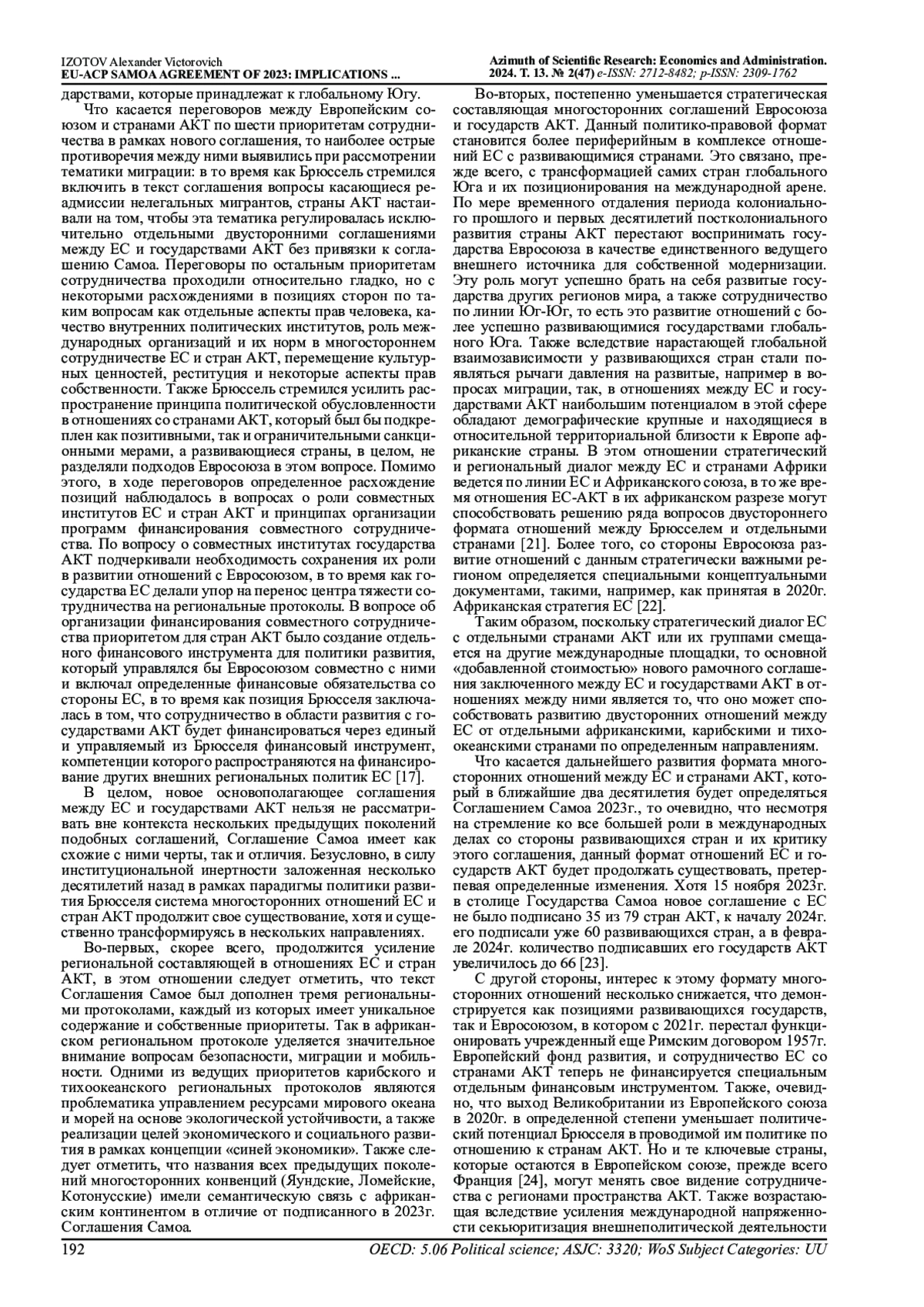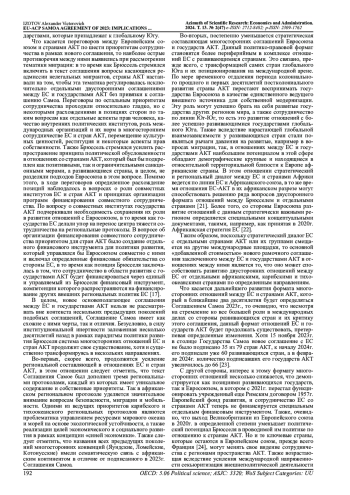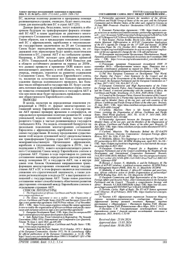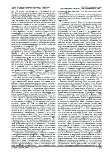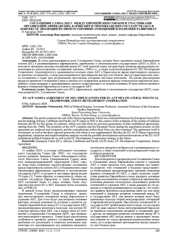 В статье рассматривается роль Соглашения Самоа, которое было заключено между Европейским союзом (ЕС) и развивающимися африканскими, карибскими и тихоокеанскими государствами (АКТ) в 2023г. в контексте эволюции системы отношений между ЕС этой группой стран, которая была заложена предыдущими поколениями их многосторонних соглашений, начиная с 1960-х гг., а также политикой развития ЕС (EU Development Cooperation). Анализируются и сравниваются позиции стран АКТ и Евросоюза во время переговорного процесса по данному соглашению, а также рассматриваются противоречия внутри этих блоков. Дается характеристика самого соглашения, а также трех региональных протоколов, которыми оно было дополнено. На основе рассмотрения процесса принятия Соглашения Самоа и анализа его содержания делаются выводы относительно перспектив дальнейшего существования и трансформации данного существующего со второй половины 20 века многостороннего формата отношений Европейского союза и государств АКТ.