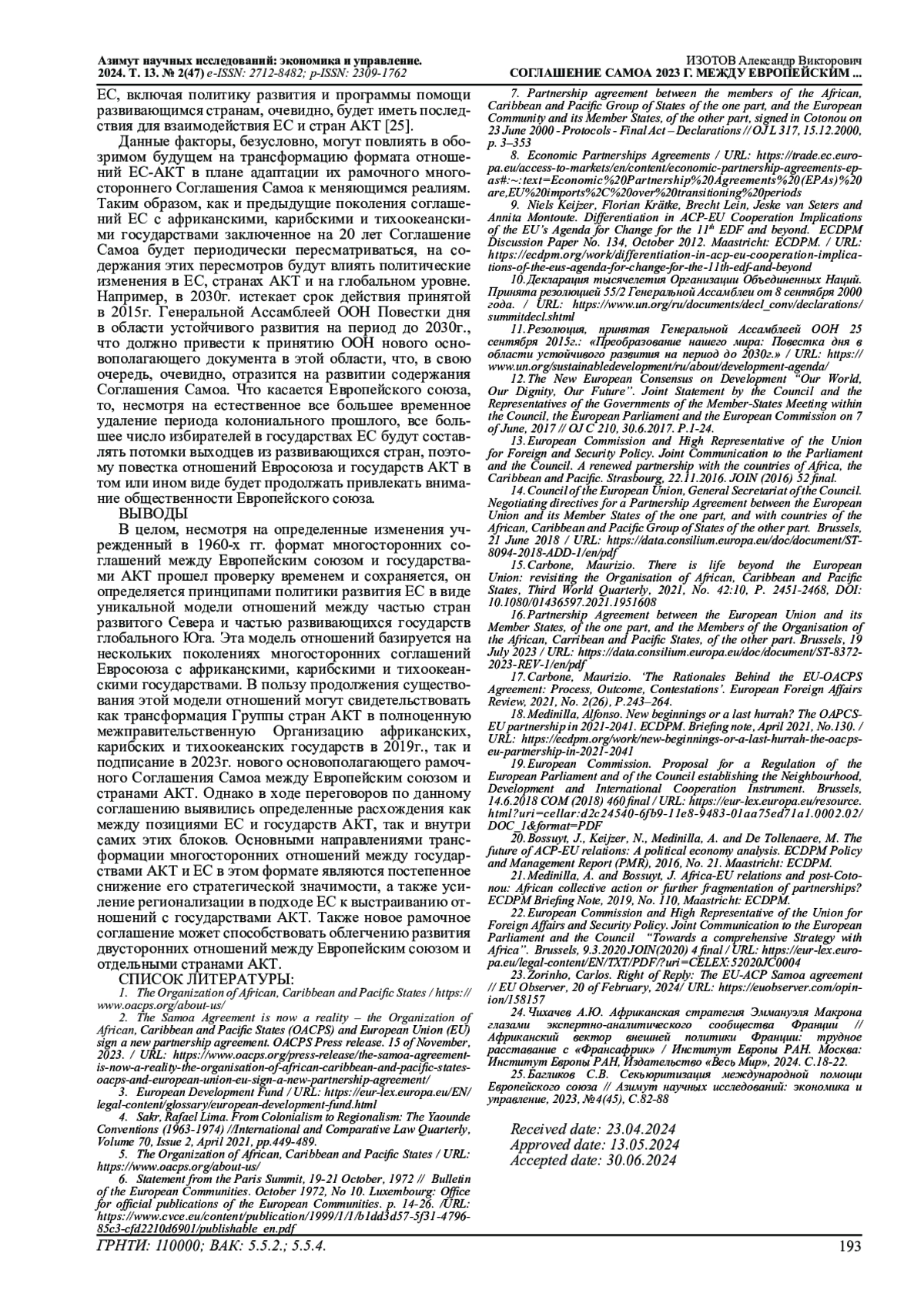 23. Zorinho, Carlos. Right of Reply: The EU-ACP Samoa agreement // EU Observer, 20 of February, 2024/ URL: https://euobserver.com/opinion/158157.