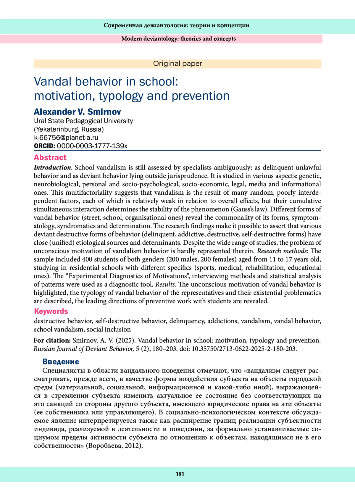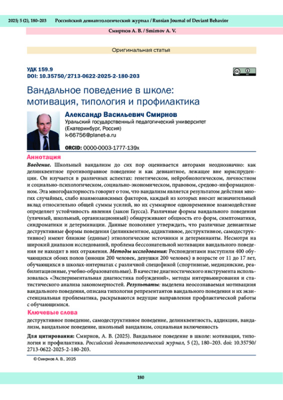 Школьный вандализм до сих пор оценивается авторами неоднозначно: как делинквентное противоправное поведение и как девиантное, лежащее вне юриспруденции. Он изучается в различных аспектах: генетическом, нейробиологическом, личностном и социально-психологическом, социально-экономическом, правовом, средово-информационном. Эта многофакторность говорит о том, что вандализм является результатом действия многих случайных, слабо взаимозависимых факторов, каждый из которых вносит незначительный вклад относительно общей суммы усилий, но их суммарное одновременное взаимодействие определяет устойчивость явления (закон Гаусса). Различные формы вандального поведения (уличный, школьный, организационный) обнаруживают общность его форм, симптоматики, синдроматики и детерминации. Данные позволяют утверждать, что различные девиантные деструктивные формы поведения (делинквентное, аддиктивное, деструктивное, самодеструктивное) имеют близкие (единые) этиологические источники и детерминанты. Несмотря на широкий диапазон исследований, проблема бессознательной мотивации вандального поведения не находит в них отражения. Методы исследования: Респондентами выступили 400 обучающихся обоих полов (юноши 200 человек, девушки 200 человек) в возрасте от 11 до 17 лет, обучающихся в школах-интернатах с различной спецификой (спортивные, медицинские, реабилитационные, учебно-образовательные). В качестве диагностического инструмента использовалась «Экспериментальная диагностика побуждений», методы интервьюирования и статистического анализа закономерностей. Результаты: выделена неосознаваемая мотивациия вандального поведения, описана типология репрезентантов вандального поведения и их экзистенциальная проблематика, раскрываются ведущие направления профлактической работы с обучающимися.