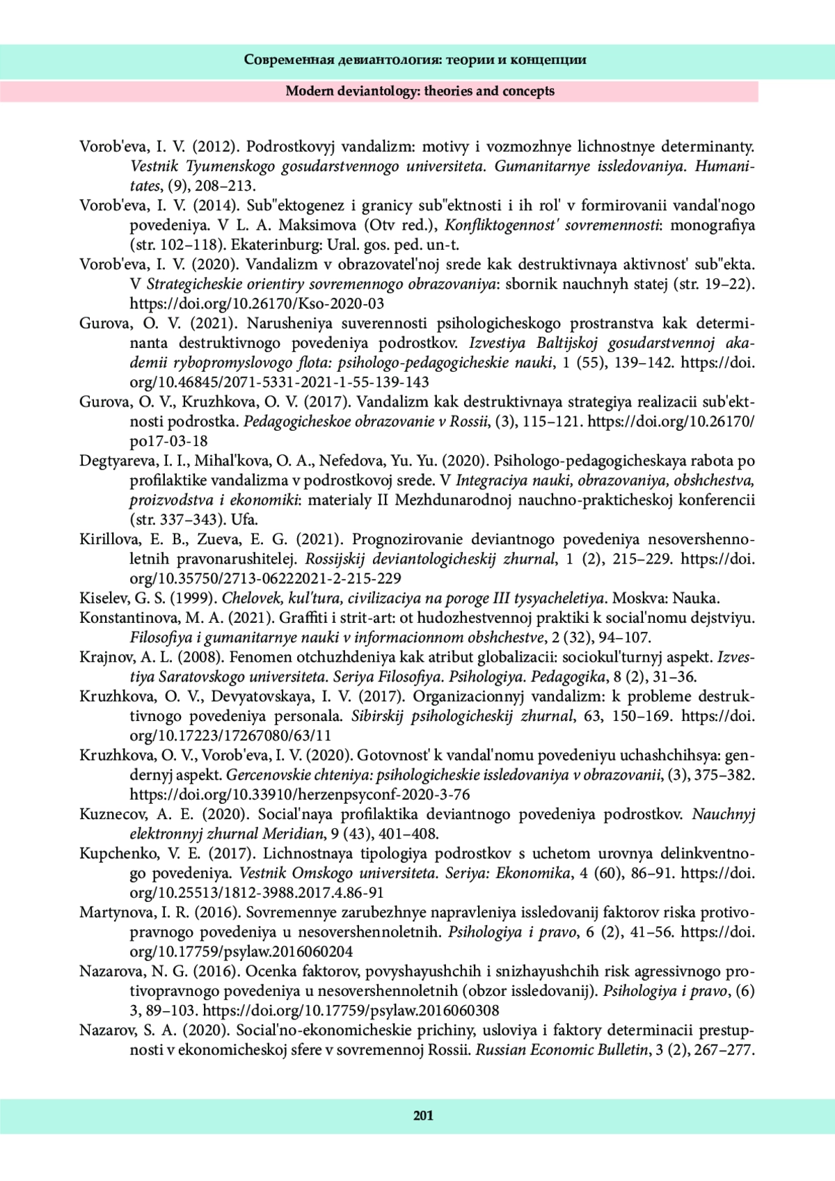 4. Воробьева, И. В. (2012). Подростковый вандализм: мотивы и возможные личностные детерминанты. Вестник Тюменского государственного университета. Гуманитарные исследования. Humanitates, (9), 208-213.