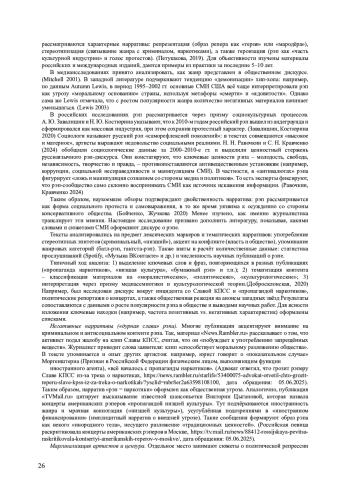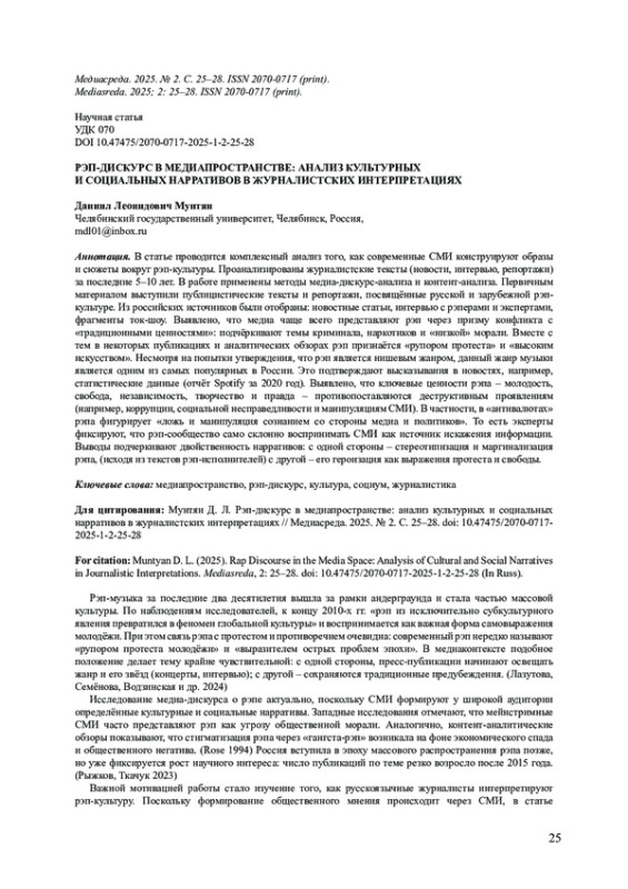 В статье проводится комплексный анализ того, как современные СМИ конструируют образы и сюжеты вокруг рэп-культуры. Проанализированы журналистские тексты (новости, интервью, репортажи) за последние 5-10 лет. В работе применены методы медиа-дискурс-анализа и контент-анализа. Первичным материалом выступили публицистические тексты и репортажи, посвящённые русской и зарубежной рэп-культуре. Из российских источников были отобраны: новостные статьи, интервью с рэперами и экспертами, фрагменты ток-шоу. Выявлено, что медиа чаще всего представляют рэп через призму конфликта с«традиционными ценностями»: подчёркивают темы криминала, наркотиков и «низкой» морали. Вместе с тем в некоторых публикациях и аналитических обзорах рэп признаётся «рупором протеста» и «высоким искусством». Несмотря на попытки утверждения, что рэп является нишевым жанром, данный жанр музыки является одним из самых популярных в России. Это подтверждают высказывания в новостях, например, статистические данные (отчёт Spotify за 2020 год). Выявлено, что ключевые ценности рэпа - молодость, свобода, независимость, творчество и правда - противопоставляются деструктивным проявлениям (например, коррупции, социальной несправедливости и манипуляциям СМИ). В частности, в «антивалютах» рэпа фигурирует «ложь и манипуляция сознанием со стороны медиа и политиков». То есть эксперты фиксируют, что рэп-сообщество само склонно воспринимать СМИ как источник искажения информации. Выводы подчеркивают двойственность нарративов: с одной стороны - стереотипизация и маргинализация рэпа, (исходя из текстов рэп-исполнителей) с другой - его героизация как выражения протеста и свободы.