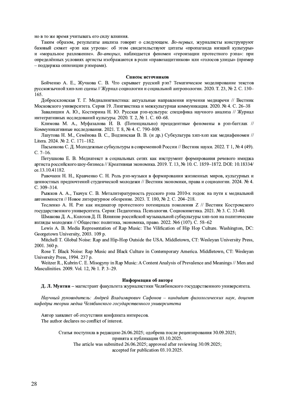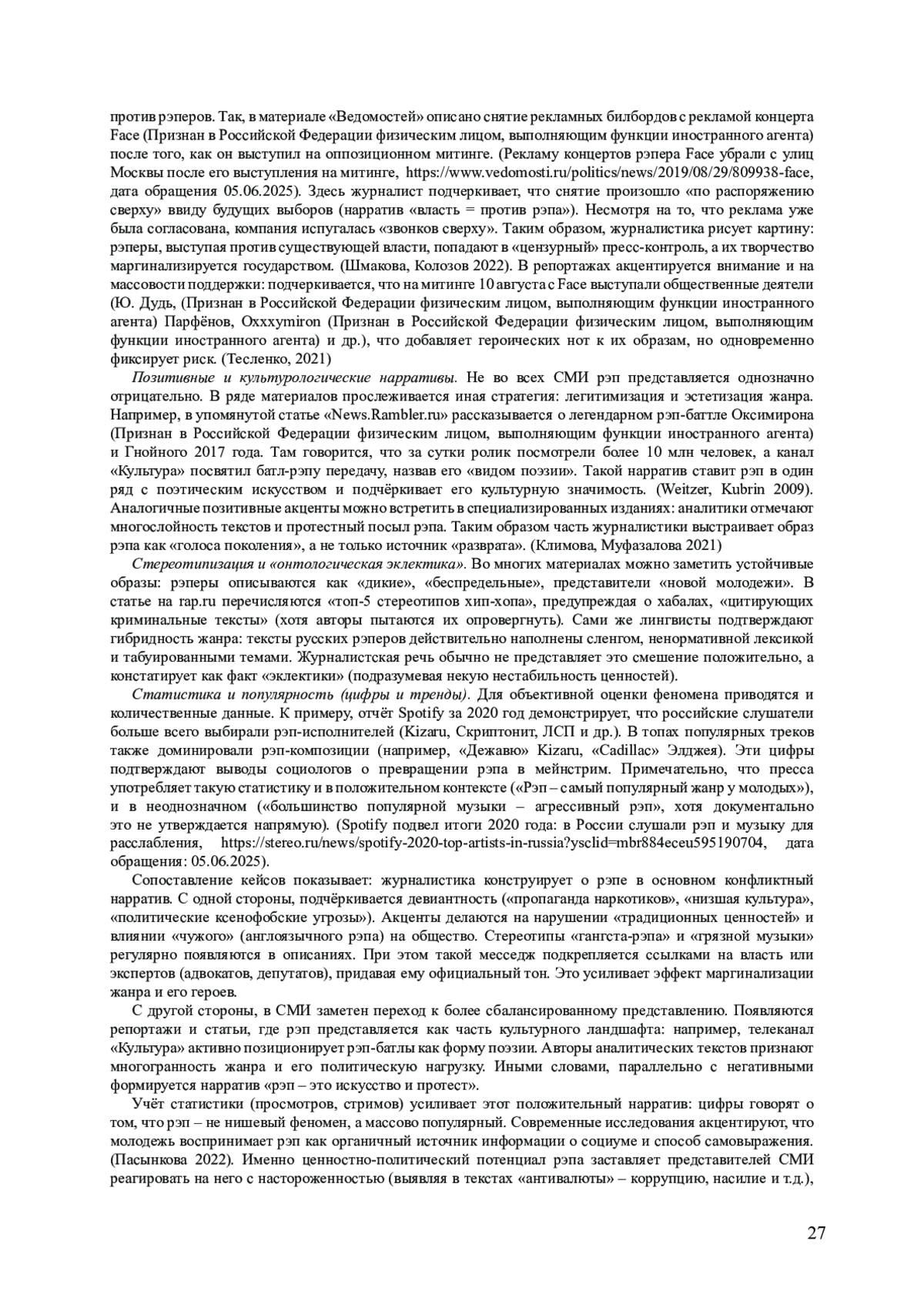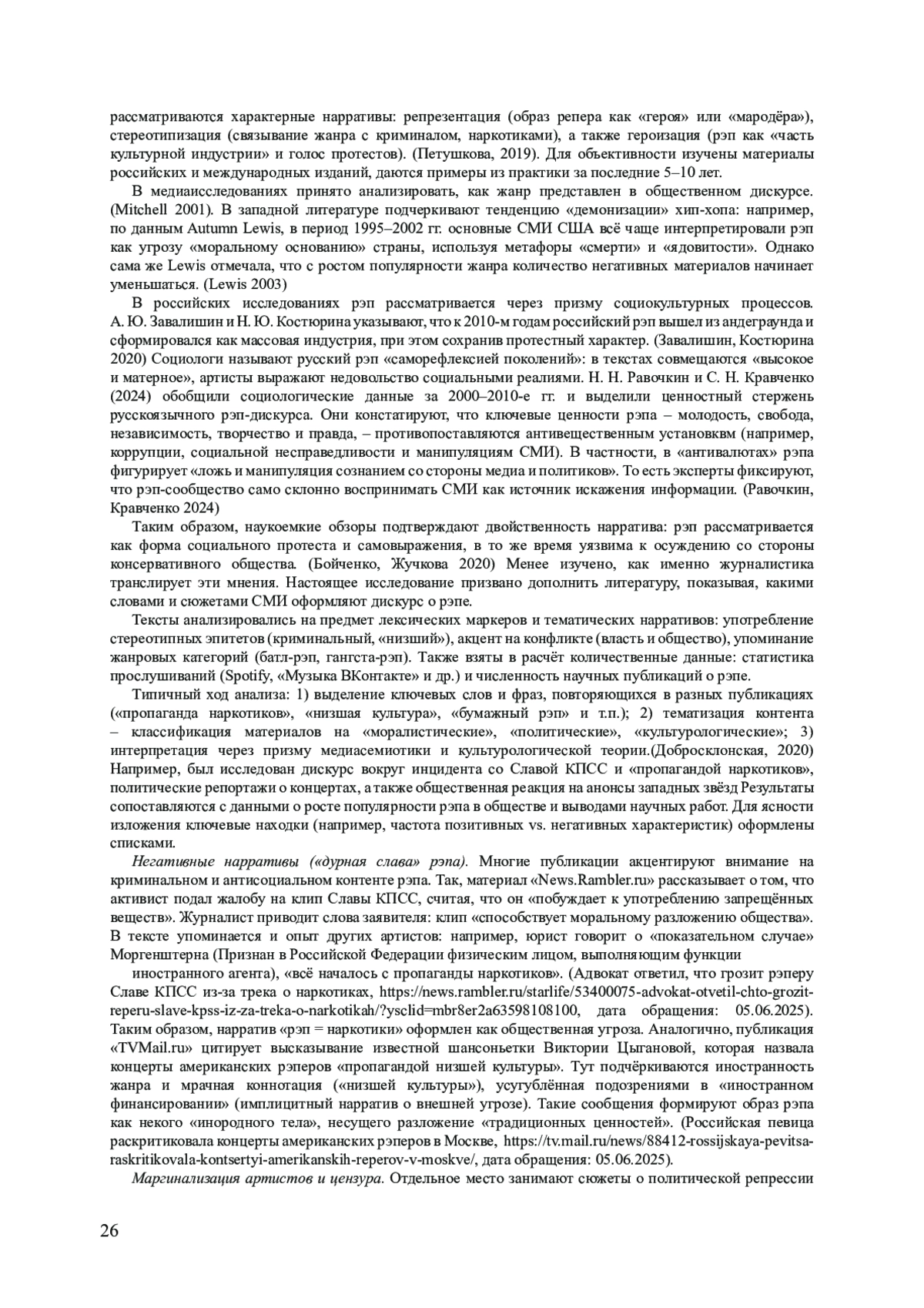 8. Равочкин Н. Н., Кравченко С. Н. Роль рэп-музыки в формировании жизненных миров, культурных и ценностных предпочтений студенческой молодежи // Вестник экономики, права и социологии. 2024. № 4. С. 309-314.
