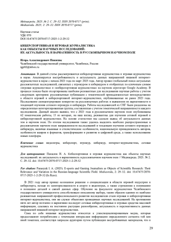 В данной статье рассматриваются киберспортивная журналистика и игровая журналистика в науке. Анализируется востребованность и актуальность данных направлений нишевой интернет-журналистики в науке с начала 2023 года по март 2025 года. Автор провел глобальный поиск актуальных русскоязычных исследований, связанных с игрожуром и кибержуром и отобранных по ключевым словам«игровая журналистика» и «киберспортивная журналистика» на научном агрегаторе Google Academy. В процессе поиска были отсортированы наиболее релевантные для исследования научные работы с учетом следующих критериев: русскоязычные публикации с тематической принадлежностью непосредственно к области игровой и киберспортивной интернет-журналистики, опубликованные не ранее 2023 года. Исследование сконцентрировано конкретно на русскоязычных работах и выявлении их вариативности и тенденций изучения сетевого игрожура и кибержура. Работы исследователей из СНГ были разделены на определенные категоризированные группы, составленные с учетом тематической направленности каждого исследования. Данный анализ выявил, что с 2023 года в русскоязычном научном поле опубликованы 62 тематические работы, 15 из которых, на наш взгляд, релевантны для изучения сетевой игровой и киберспортивной журналистики. На основе статистики мы сделали вывод об актуальности данных тем в научном поле. По итогам исследования также удалось выделить наиболее распространенные в русскоязычном научном поле направленности исследований и тенденции изучения сетевого игрожура и кибержура, включая языковые и стилистические особенности, национальную принадлежность авторов, особенности жанров и форматов, трансформацию и развитие в цифровой среде, а также использование новых платформ.