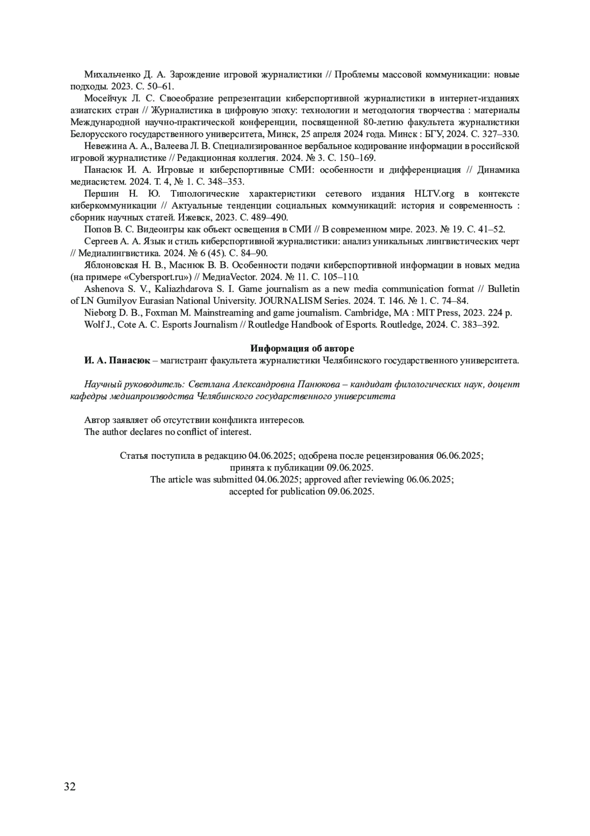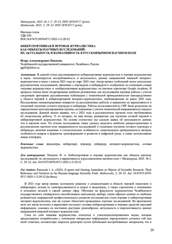 8. Панасюк И. А. Игровые и киберспортивные СМИ: особенности и дифференциация // Динамика медиасистем. 2024. Т. 4, № 1. С. 348-353.