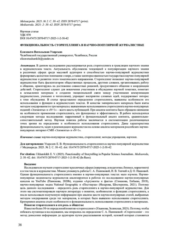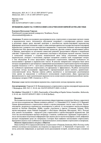 В данном исследовании рассматривается роль сторителлинга в трансляции научного знания в журналистском тексте. Актуальность обусловлена тенденцией к популяризации научного знания в различных сферах среди массовой аудитории и способностью научно-популярной журналистики формировать целостное понимание о мире, а также заинтересованностью государства в научно-популярной журналистике и развитии этого тематического направления. Сторителлинг позволяет научно-популярной журналистике быть фасилитатором общественных процессов, другими словами, организовывать работу и общение, ориентируясь на достижение совместных решений, продуктивного общения и координации действий. Сторителлинг служит для вовлечения участников в обсуждение научной тематики, помогает в осмыслении материала и создании эмоциональной связи между участниками коммуникации (журналистами, учеными и читателями), упрощает восприятие сложных идей, поддерживает интерес к теме обсуждения. В статье представлено определение сторителлинга, выявлены особенности его использования и функции в журналистских текстах. В качестве эмпирического материала были взяты методом зондирования по три материала с выявленным использованием сторителлинга научно-популярных изданий «Элементы» и «N+1» - всего шесть публикаций. При анализе контента было обращено внимание на особенности применения сторителлинга, его функционал и эффективность. В работе используются следующие методы исследования: нарративный и функциональный анализ контента, сравнительно-сопоставительный метод. Научная новизна работы заключается в систематизации различающихся точек зрения на определение и особенности использования сторителлинга. Даны характеристика функциональности, задач и рекомендации журналистам на основе анализа материалов российских научно-популярных интернет-СМИ «Элементы» и «N+1».