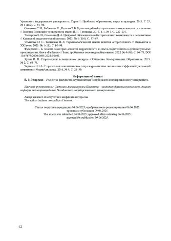14. Футерман Е. Б. Анализ некоторых аспектов нарративности и опыта сторителлинга в аудиовизуальных произведениях блога «Parfenon» // Знак: проблемное поле медиаобразования. 2022. № 4 (46). С. 66-73. DOI 10.47475/2070-0695-2022-10409.