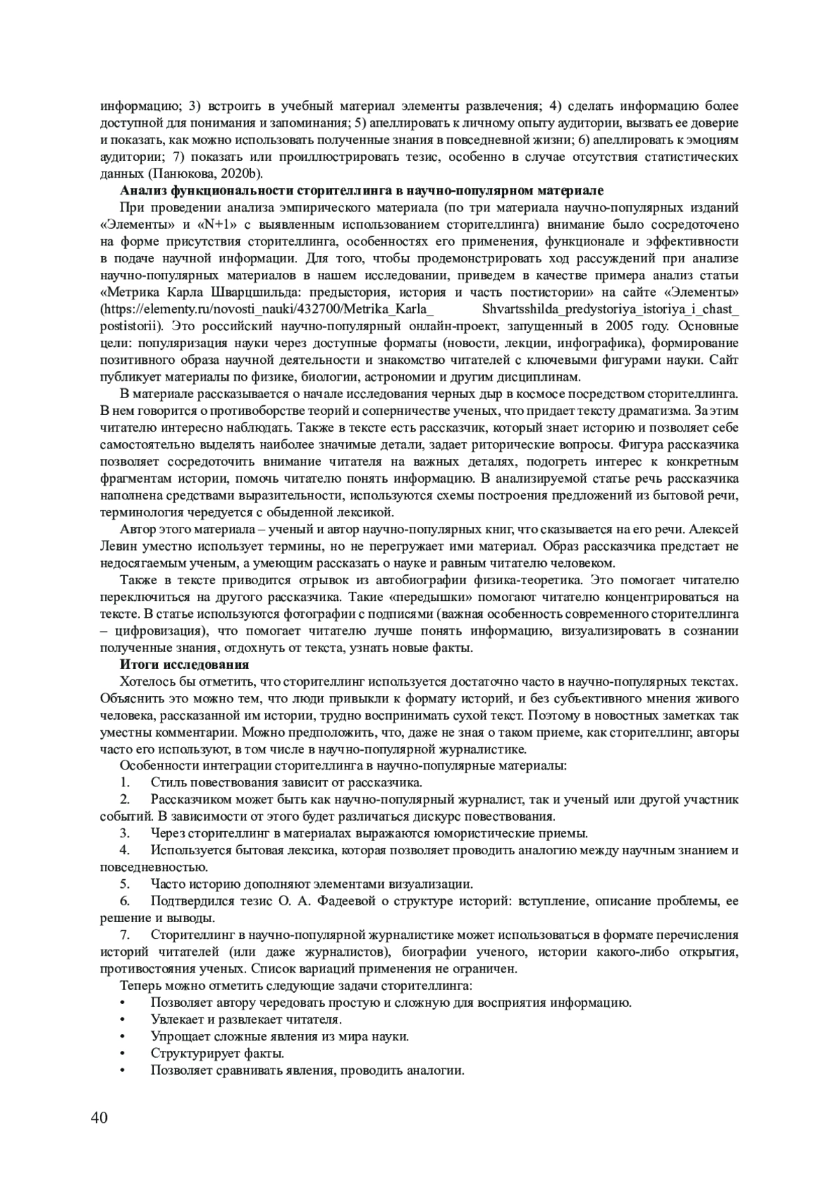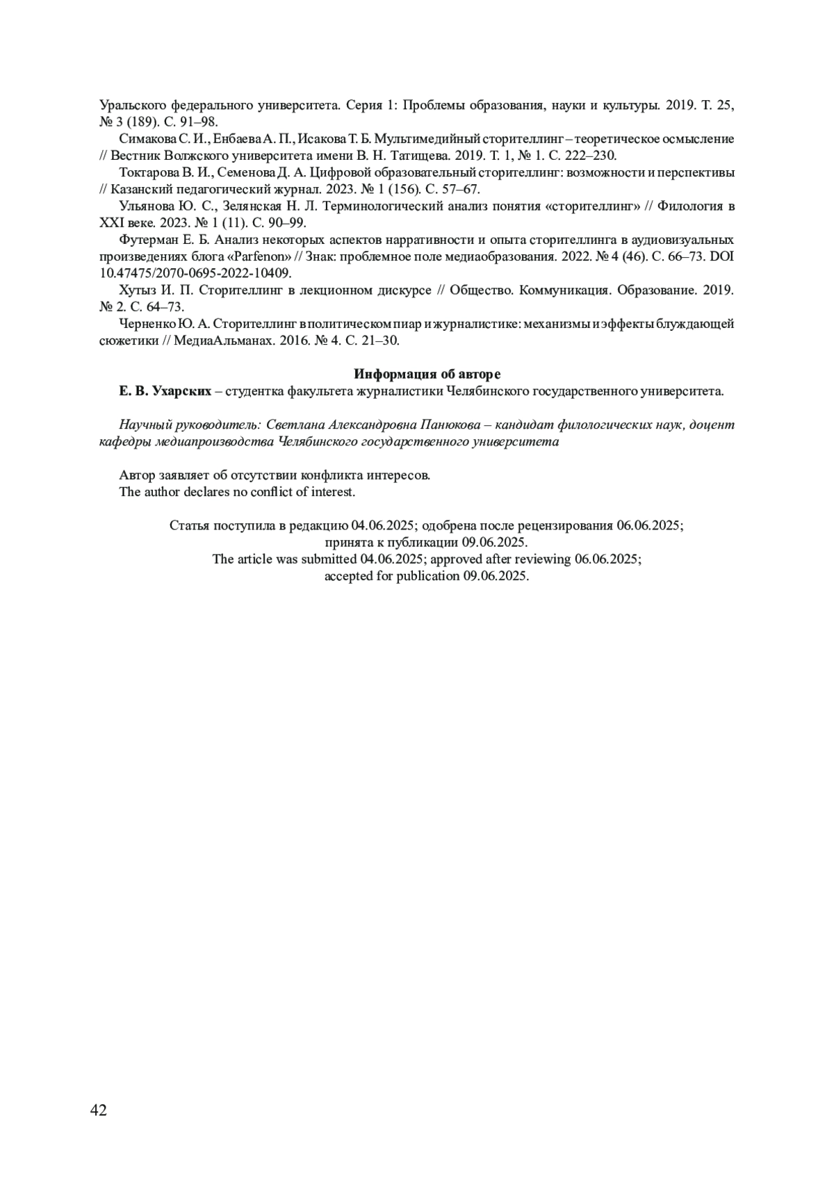 8. Панюкова С. А. Функциональность метода цифрового сторителлинга в научно-популярных материалах // Известия Уральского федерального университета имени первого Президента Б. Н. Ельцина. Серия 1: Проблемы образования, науки и культуры. 2020. Т. 26, № 3 (199). С. 105-111. DOI 10.15826/izv1.2020.26.3.053.