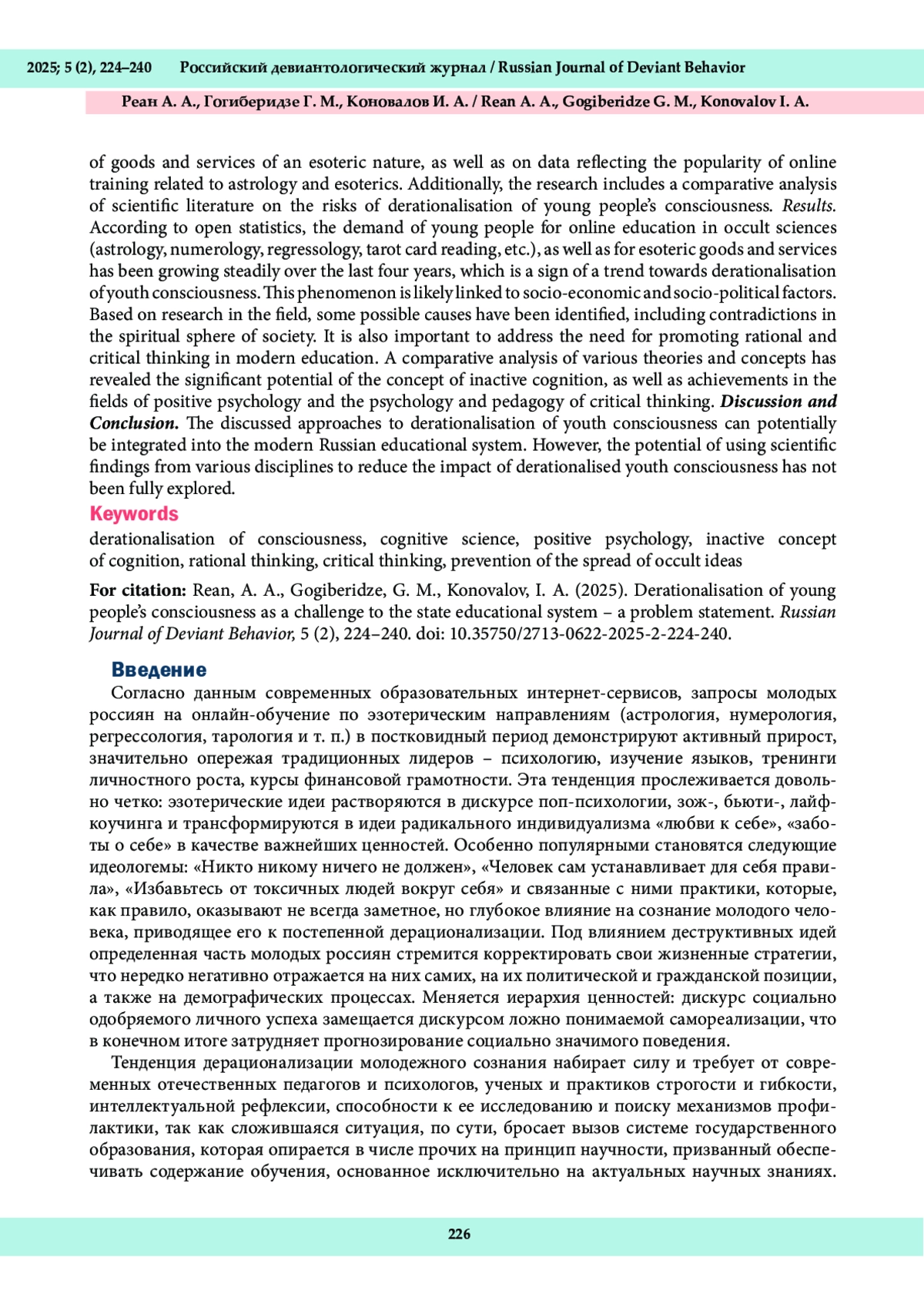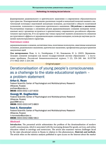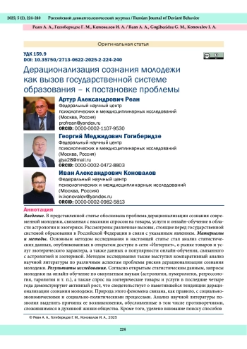 В представленной статье обоснована проблема дерационализации сознания современной молодежи, связанная с высоким спросом на товары, услуги и онлайн-обучение в области астрологии и эзотерики. Рассмотрены различные вызовы, стоящие перед государственной системой образования в Российской Федерации в связи с указанным явлением. Материалы и методы. Основным методом исследования в настоящей статье стал анализ статистических данных, опубликованных в открытом доступе в сети «Интернет», о рынке товаров и услуг эзотерического характера, а также данных о популярности онлайн-обучения, связанного с астрологией и эзотерикой. Методом исследования также выступил компаративный анализ научной литературы по различным аспектам проблемы рисков дерационализации сознания молодежи. Результаты исследования. Согласно открытым статистическим данным, запросы молодежи на онлайн-обучение по оккультным наукам (астрология, нумерология, регрессология, тарология и т. п.), а также спрос на эзотерические товары и услуги в последние четыре года демонстрируют активный рост, что свидетельствует о наметившейся тенденции дерационализации сознания молодежи. Природа этого феномена связана, как правило, с социальноэкономическими и социально-политическими процессами. Анализ научной литературы позволил выделить причины ее возникновения, обусловленные в том числе противоречиями, сложившимися в духовной жизни общества. Кроме того, уделено внимание поиску способов формирования рационального и критического мышления в современном образовательном пространстве. Компаративный анализ различных теорий и концепций позволил выявить значительный потенциал энактивной концепции познания, достижений в области позитивной психологии, психологии и педагогики критического мышления. Обсуждение и заключение. Рассмотренные подходы к снижению рисков дерационализации сознания молодежи потенциально могут органично встроиться в архитектонику современного российского образовательного пространства. В то же время еще только предстоит выявить возможности снижения деструктивного эффекта от дерационализации сознания молодежи, используя научные достижения мультиотраслевого характера.