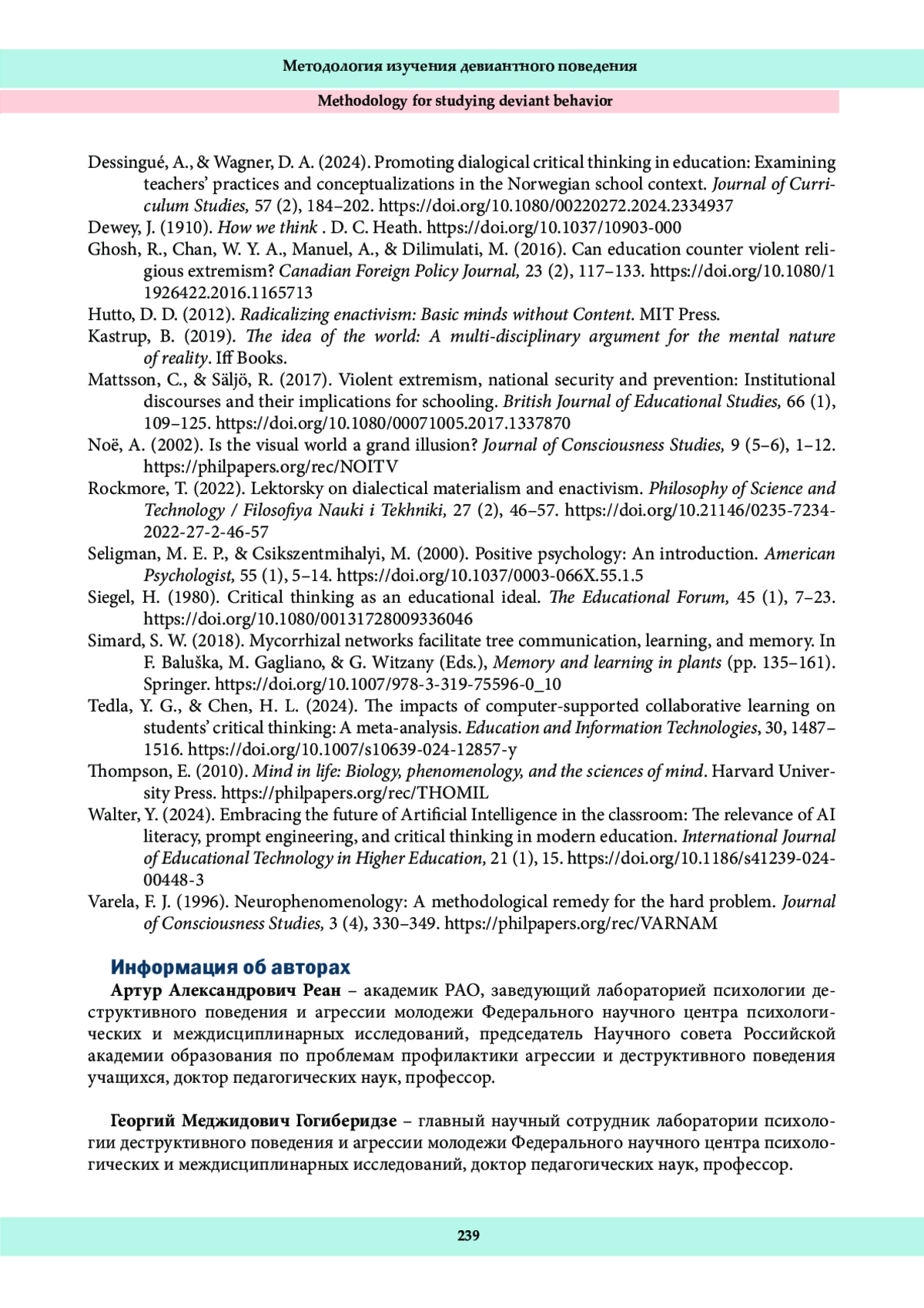 38. Dessingué, A., & Wagner, D. A. (2024). Promoting dialogical critical thinking in education: Examining teachers’ practices and conceptualizations in the Norwegian school context. Journal of Curri-culum Studies, 57 (2), 184-202. DOI: 10.1080/00220272.2024.2334937
