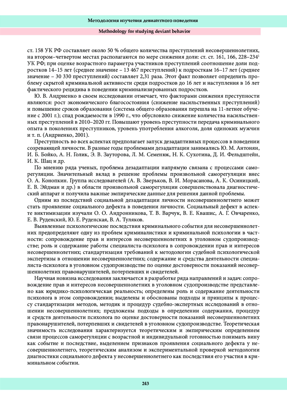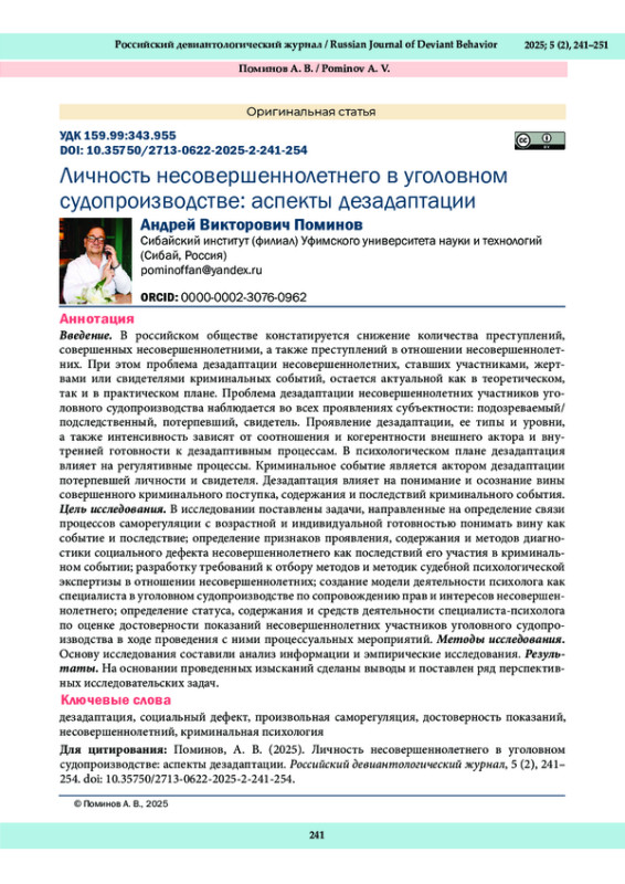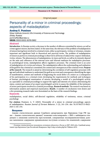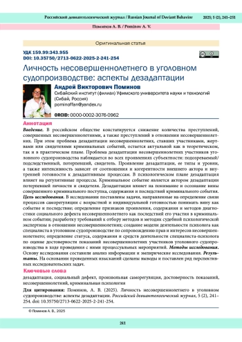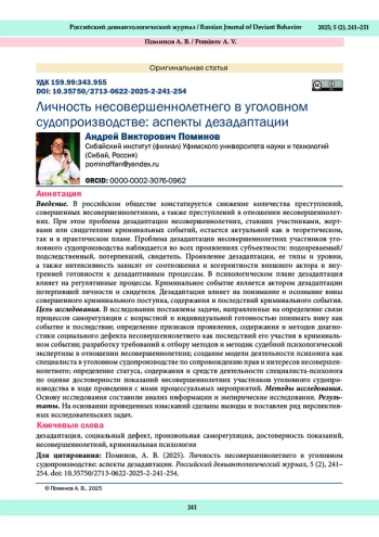 В российском обществе констатируется снижение количества преступлений, совершенных несовершеннолетними, а также преступлений в отношении несовершеннолетних. При этом проблема дезадаптации несовершеннолетних, ставших участниками, жертвами или свидетелями криминальных событий, остается актуальной как в теоретическом, так и в практическом плане. Проблема дезадаптации несовершеннолетних участников уголовного судопроизводства наблюдается во всех проявлениях субъектности: подозреваемый/ подследственный, потерпевший, свидетель. Проявление дезадаптации, ее типы и уровни, а также интенсивность зависят от соотношения и когерентности внешнего актора и внутренней готовности к дезадаптивным процессам. В психологическом плане дезадаптация влияет на регулятивные процессы. Криминальное событие является актором дезадаптации потерпевшей личности и свидетеля. Дезадаптация влияет на понимание и осознание вины совершенного криминального поступка, содержания и последствий криминального события. Цель исследования. В исследовании поставлены задачи, направленные на определение связи процессов саморегуляции с возрастной и индивидуальной готовностью понимать вину как событие и последствие; определение признаков проявления, содержания и методов диагностики социального дефекта несовершеннолетнего как последствий его участия в криминальном событии; разработку требований к отбору методов и методик судебной психологической экспертизы в отношении несовершеннолетних; создание модели деятельности психолога как специалиста в уголовном судопроизводстве по сопровождению прав и интересов несовершеннолетнего; определение статуса, содержания и средств деятельности специалиста-психолога по оценке достоверности показаний несовершеннолетних участников уголовного судопроизводства в ходе проведения с ними процессуальных мероприятий. Методы исследования. Основу исследования составили анализ информации и эмпирические исследования. Результаты. На основании проведенных изысканий сделаны выводы и поставлен ряд перспективных исследовательских задач.