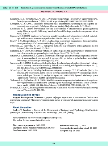 22. Руденский, Е. В. (2020). Субъектная виктимность личности подростка как уязвимость жизнеспособности: феноменология, гносеология и онтология. СМАЛЬТА, (3), 32-40.