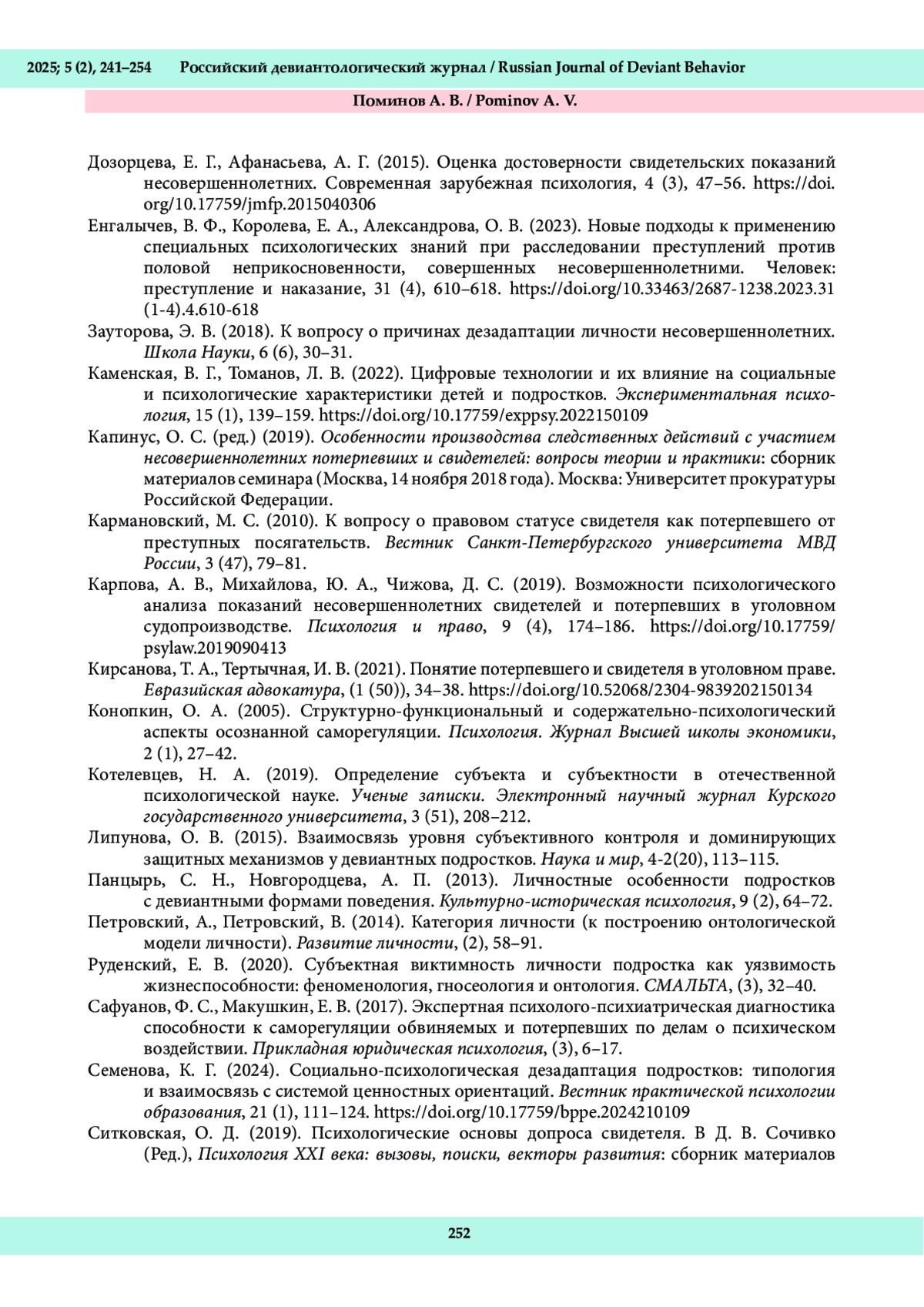 9. Дозорцева, Е. Г., Афанасьева, А. Г. (2015). Оценка достоверности свидетельских показаний несовершеннолетних. Современная зарубежная психология, 4 (3), 47-56. DOI: 10.17759/jmfp.2015040306 EDN: VBISXD