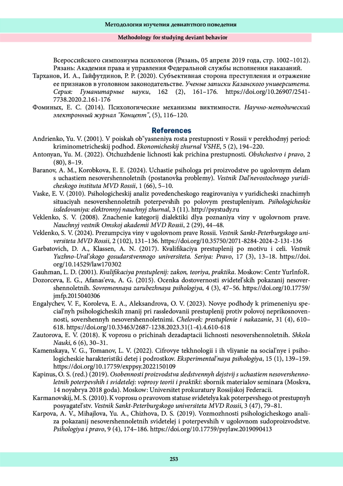 6. Векленко, С. В. (2024). Презумпция вины в уголовном праве России. Вестник Санкт-Петербургского университета МВД России, 2 (102), 131-136. DOI: 10.35750/2071-8284-2024-2-131-136