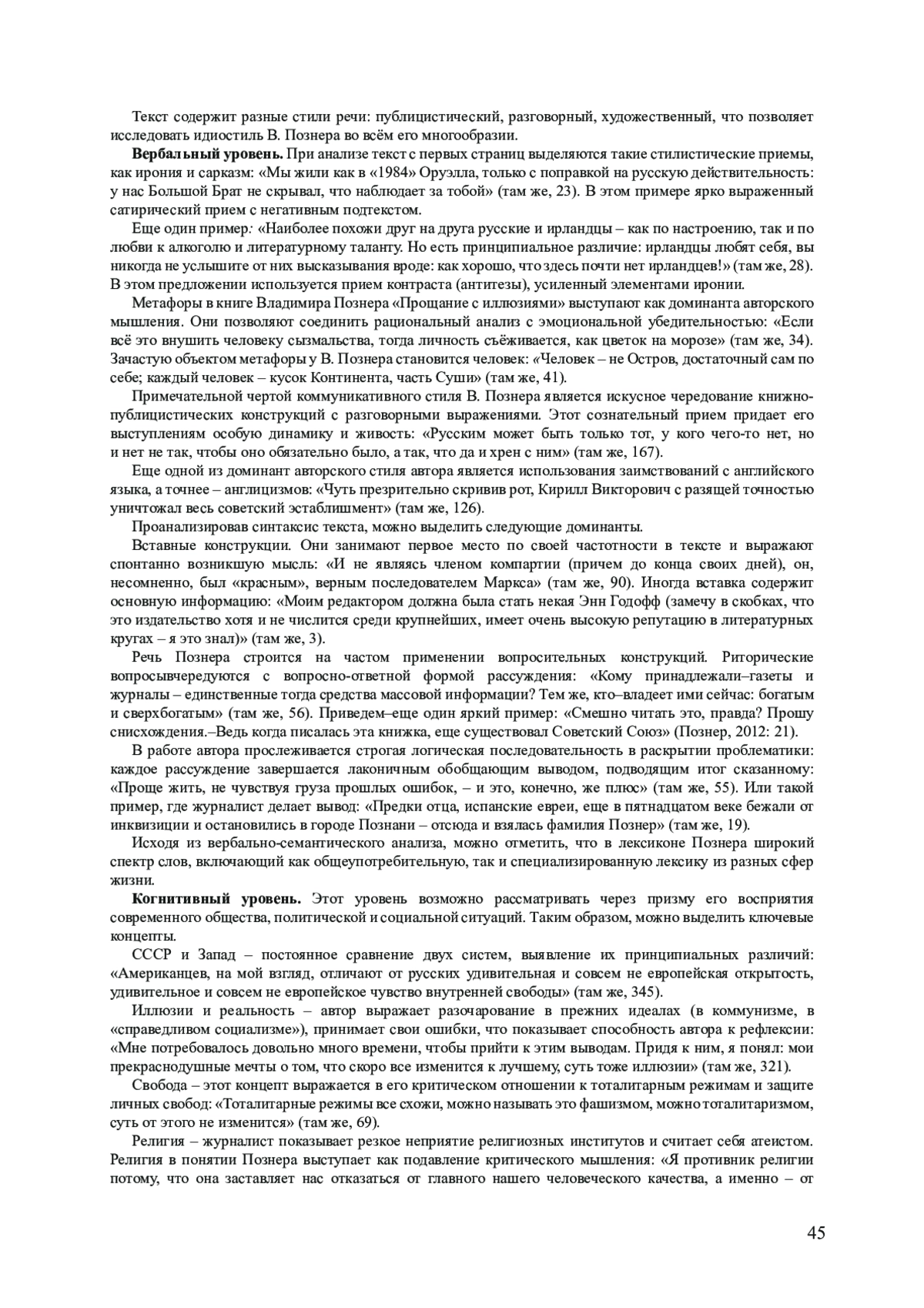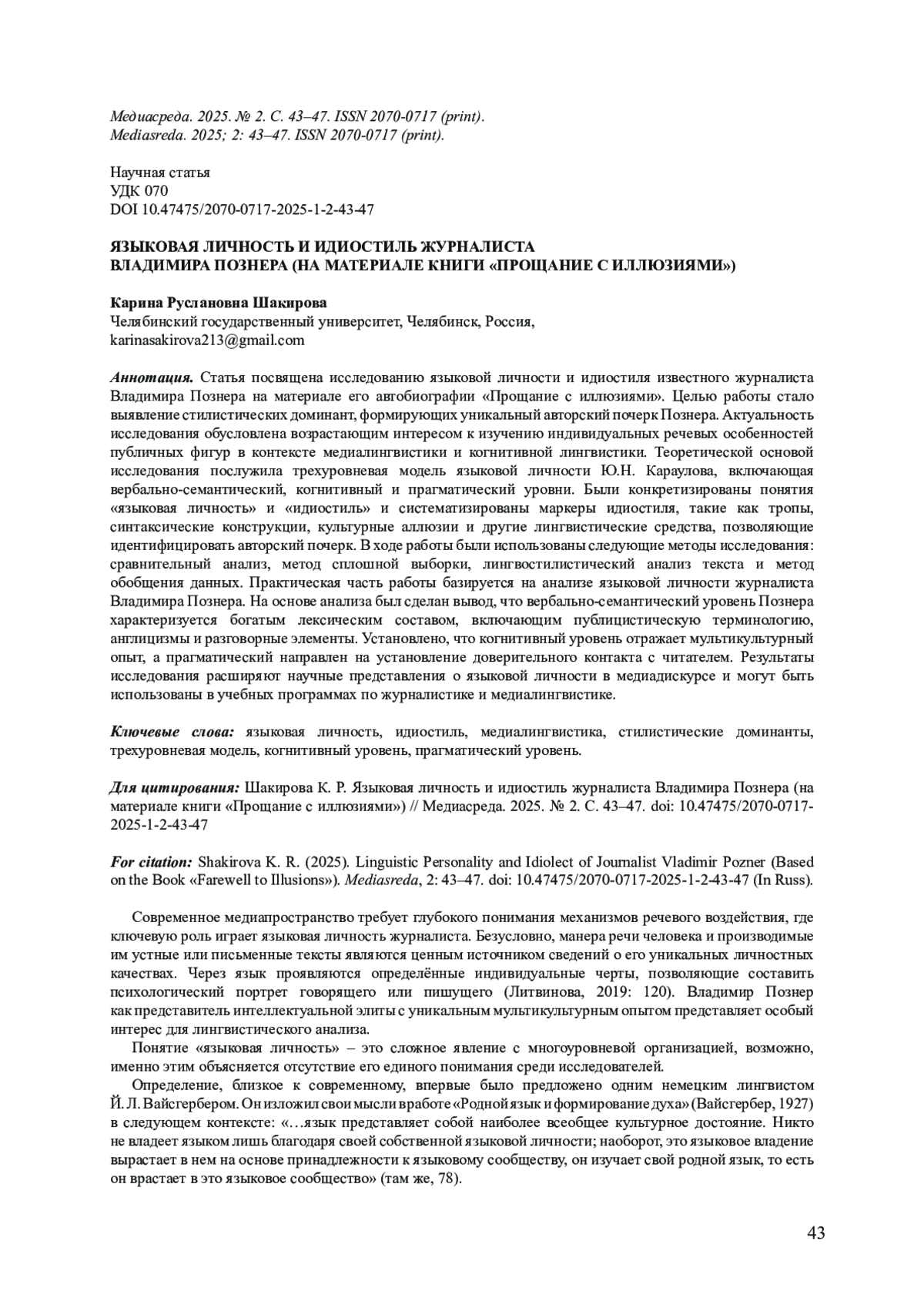 Статья посвящена исследованию языковой личности и идиостиля известного журналиста Владимира Познера на материале его автобиографии «Прощание с иллюзиями». Целью работы стало выявление стилистических доминант, формирующих уникальный авторский почерк Познера. Актуальность исследования обусловлена возрастающим интересом к изучению индивидуальных речевых особенностей публичных фигур в контексте медиалингвистики и когнитивной лингвистики. Теоретической основой исследования послужила трехуровневая модель языковой личности Ю. Н. Караулова, включающая вербально-семантический, когнитивный и прагматический уровни. Были конкретизированы понятия«языковая личность» и «идиостиль» и систематизированы маркеры идиостиля, такие как тропы, синтаксические конструкции, культурные аллюзии и другие лингвистические средства, позволяющие идентифицировать авторский почерк. В ходе работы были использованы следующие методы исследования: сравнительный анализ, метод сплошной выборки, лингвостилистический анализ текста и метод обобщения данных. Практическая часть работы базируется на анализе языковой личности журналиста Владимира Познера. На основе анализа был сделан вывод, что вербально-семантический уровень Познера характеризуется богатым лексическим составом, включающим публицистическую терминологию, англицизмы и разговорные элементы. Установлено, что когнитивный уровень отражает мультикультурный опыт, а прагматический направлен на установление доверительного контакта с читателем. Результаты исследования расширяют научные представления о языковой личности в медиадискурсе и могут быть использованы в учебных программах по журналистике и медиалингвистике.