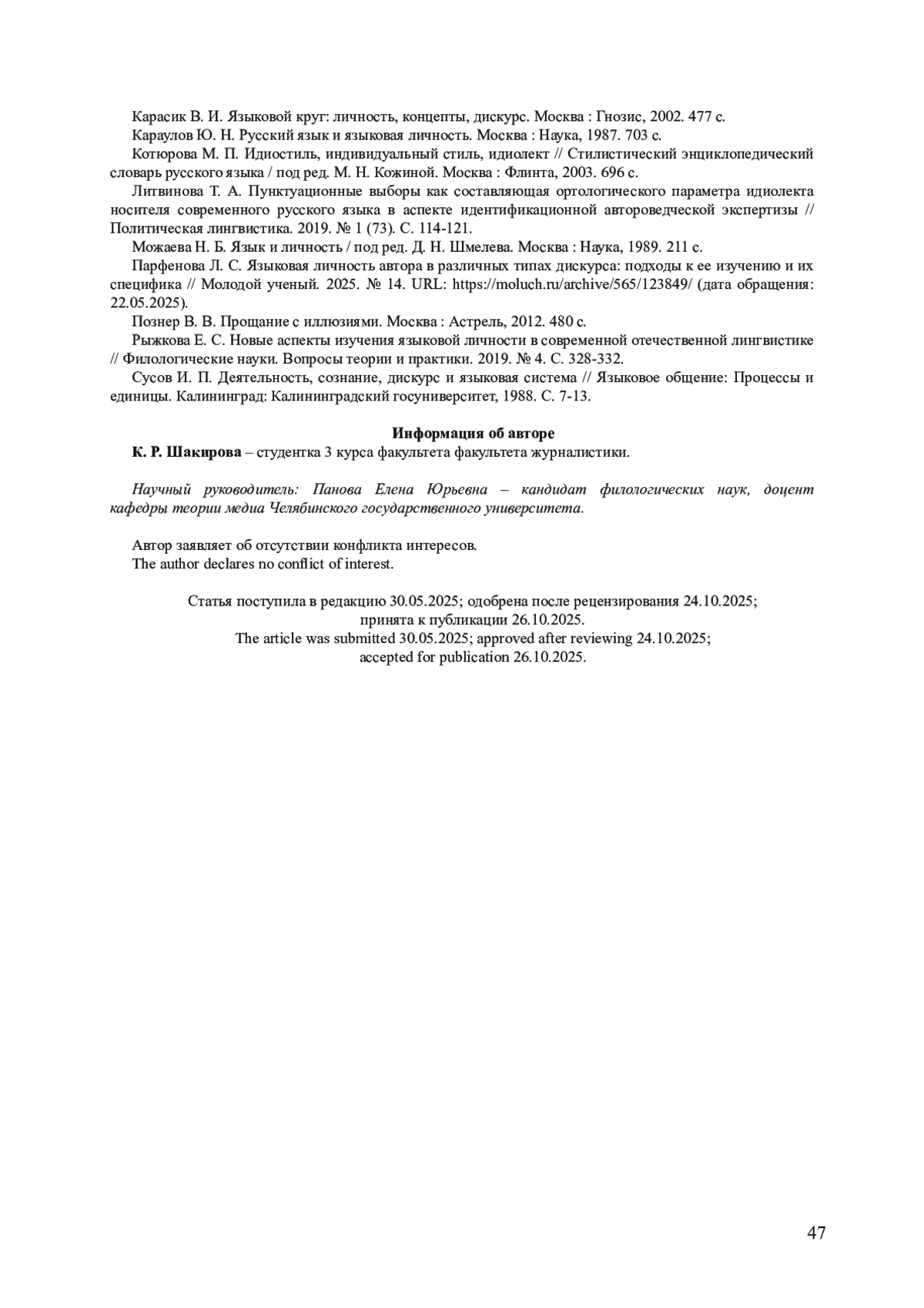 9. Литвинова Т. А. Пунктуационные выборы как составляющая ортологического параметра идиолекта носителя современного русского языка в аспекте идентификационной автороведческой экспертизы // Политическая лингвистика. 2019. № 1 (73). С. 114-121.