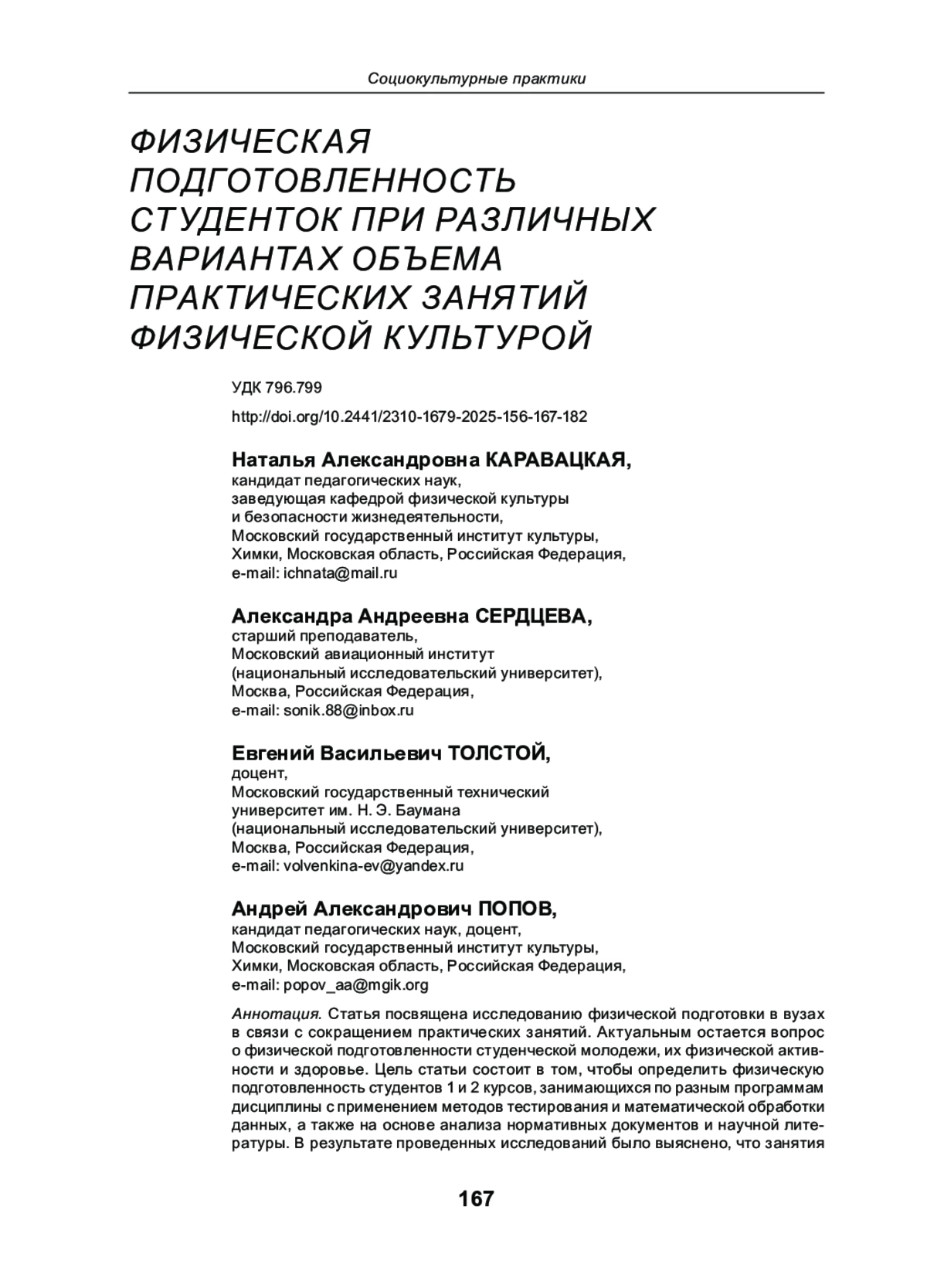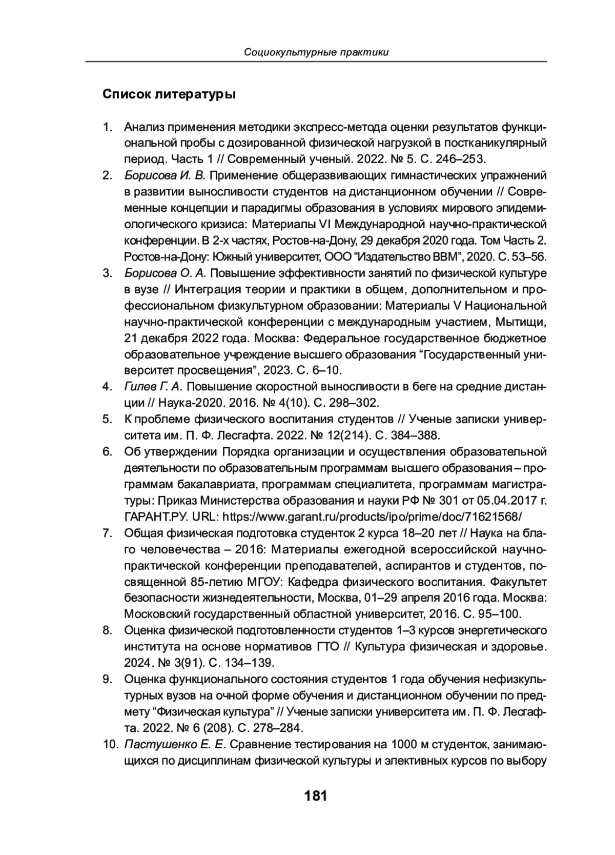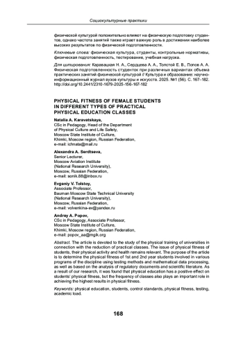 9. Оценка функционального состояния студентов 1 года обучения нефизкультурных вузов на очной форме обучения и дистанционном обучении по предмету “Физическая культура” // Ученые записки университета им. П. Ф. Лесгафта. 2022. № 6 (208). С. 278-284. EDN: BQODQU