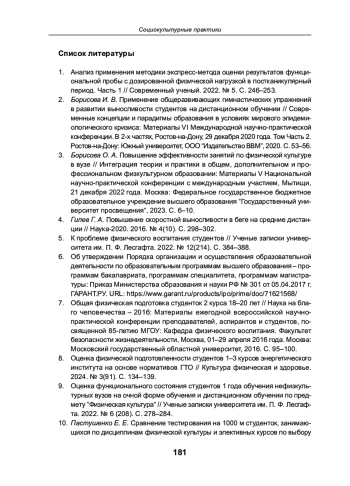 3. Борисова О. А. Повышение эффективности занятий по физической культуре в вузе // Интеграция теории и практики в общем, дополнительном и профессиональном физкультурном образовании: Материалы V Национальной научно-практической конференции с международным участием, Мытищи, 21 декабря 2022 года. Москва: Федеральное государственное бюджетное образовательное учреждение высшего образования “Государственный университет просвещения”, 2023. С. 6-10. EDN: UKPFQU