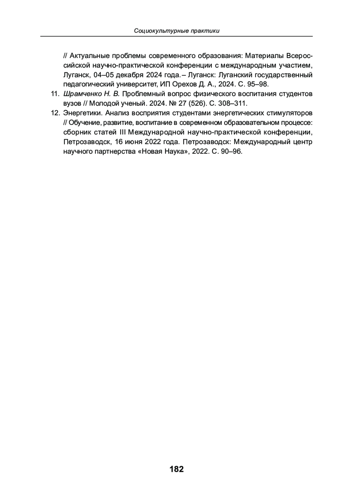 11. Шрамченко Н. В. Проблемный вопрос физического воспитания студентов вузов // Молодой ученый. 2024. № 27 (526). С. 308-311. EDN: ACLVIQ