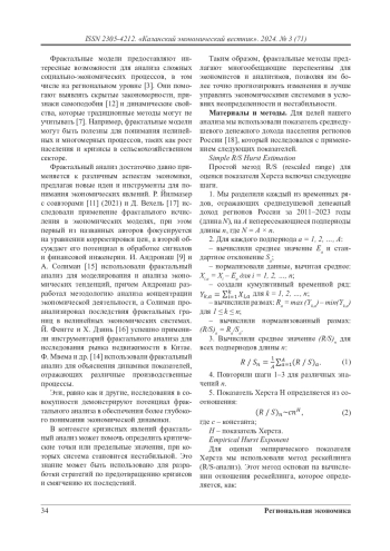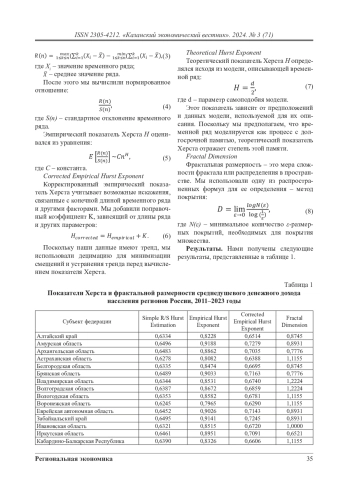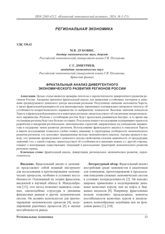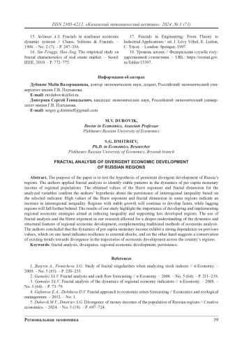 Целью статьи является проверка гипотезы о персистентности дивергентного развития регионов России. Авторами применен фрактальный анализ для выявления устойчивых паттернов в динамике среднедушевого денежного дохода населения регионов. Полученные значения экспоненты Херста, а также фрактальной размерности для анализируемых переменных подтверждают авторскую гипотезу об устойчивости межрегионального неравенства по выбранному показателю. Высокие значения показателя Херста и фрактальной размерности в некоторых регионах свидетельствуют об увеличении межрегионального неравенства. Регионы с устойчивым ростом будут продолжать развиваться быстрее, в то время как отстающие регионы будут все больше отставать. Результаты нашего исследования подчеркивают важность разработки и внедрения региональных экономических стратегий, направленных на уменьшение неравенства и поддержку менее развитых регионов. Использование фрактального анализа и показателя Херста в нашем исследовании позволило глубже понять динамику и структурные особенности экономического развития регионов, что дополняет традиционные методы экономического анализа. Авторы пришли к выводу, что динамике среднедушевого денежного дохода свойственна сильная зависимость от предыдущих значений, что, с одной стороны, свидетельствует об устойчивости к внешним шокам, а с другой стороны, говорит о консервации существующих тенденций к расхождению траекторий экономического развития регионов страны.