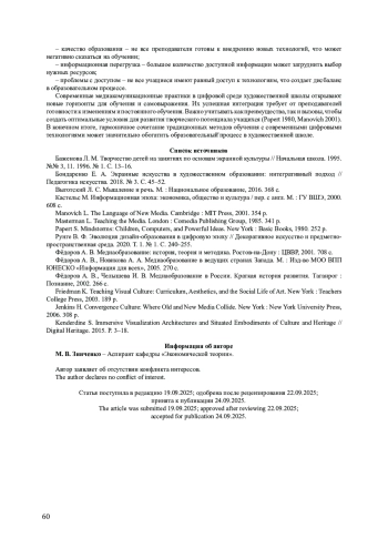 2. Бондаренко Е. А. Экранные искусства в художественном образовании: интегративный подход // Педагогика искусства. 2018. № 3. С. 45-52.