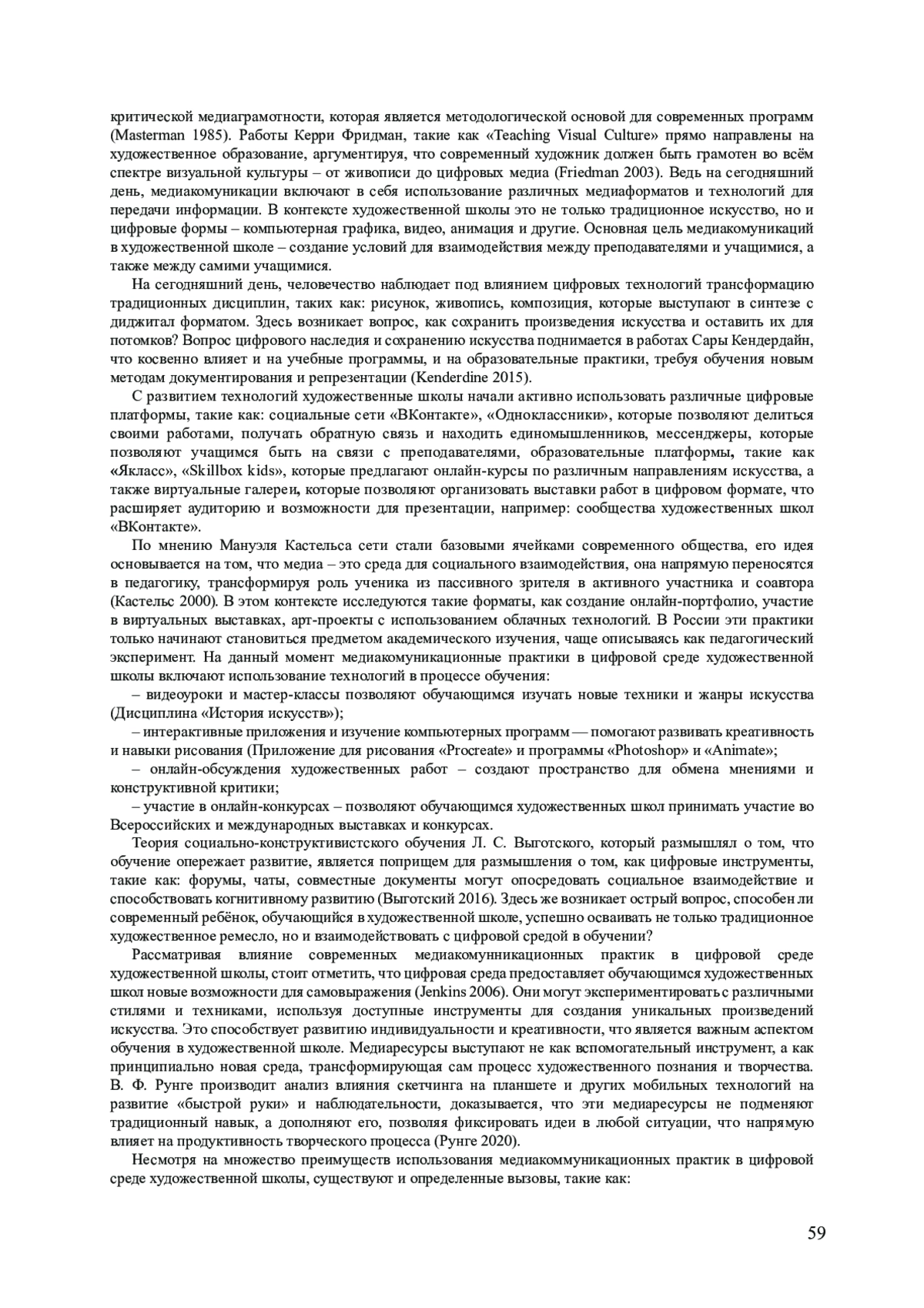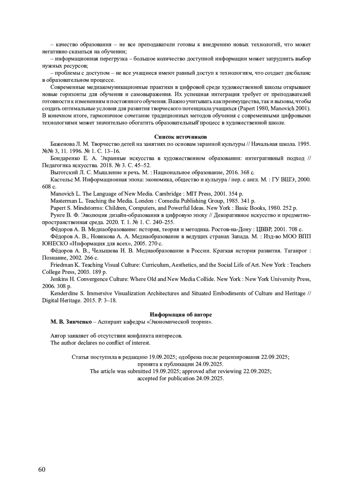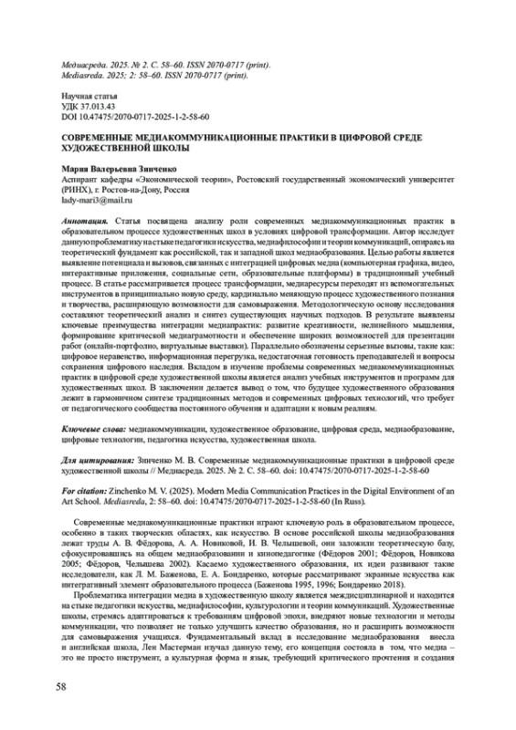 Статья посвящена анализу роли современных медиакоммуникационных практик в образовательном процессе художественных школ в условиях цифровой трансформации. Автор исследует данную проблематику на стыке педагогики искусства, медиафилософии и теории коммуникаций, опираясь на теоретический фундамент как российской, так и западной школ медиаобразования. Целью работы является выявление потенциала и вызовов, связанных с интеграцией цифровых медиа (компьютерная графика, видео, интерактивные приложения, социальные сети, образовательные платформы) в традиционный учебный процесс. В статье рассматривается процесс трансформации, медиаресурсы переходят из вспомогательных инструментов в принципиально новую среду, кардинально меняющую процесс художественного познания и творчества, расширяющую возможности для самовыражения. Методологическую основу исследования составляют теоретический анализ и синтез существующих научных подходов. В результате выявлены ключевые преимущества интеграции медиапрактик: развитие креативности, нелинейного мышления, формирование критической медиаграмотности и обеспечение широких возможностей для презентации работ (онлайн-портфолио, виртуальные выставки). Параллельно обозначены серьезные вызовы, такие как: цифровое неравенство, информационная перегрузка, недостаточная готовность преподавателей и вопросы сохранения цифрового наследия. Вкладом в изучение проблемы современных медиакоммуникационных практик в цифровой среде художественной школы является анализ учебных инструментов и программ для художественных школ. В заключении делается вывод о том, что будущее художественного образования лежит в гармоничном синтезе традиционных методов и современных цифровых технологий, что требует от педагогического сообщества постоянного обучения и адаптации к новым реалиям.