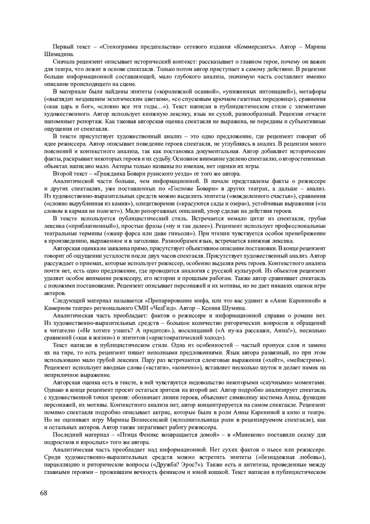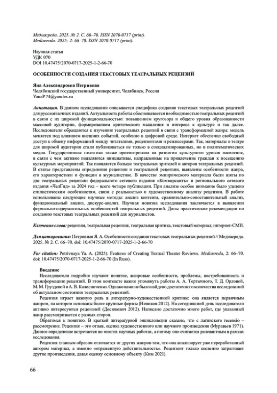 В данном исследовании описывается специфика создания текстовых театральных рецензий для русскоязычных изданий. Актуальность работы обосновывается необходимостью театральных рецензий в связи с их широкой функциональностью: повышением кругозора и общего уровня образованности массовой аудитории, формированием критического мышления и интереса к культуре и так далее. Исследователи обращаются к изучению театральных рецензий в связи с трансформацией жанра: модель меняется под влиянием внешних событий, особенно в цифровой среде. Интернет обеспечил свободный доступ к обмену информацией между читателями, рецензентами и режиссерами. Так, материалы о театре для широкой аудитории стали публиковаться не только в специализированных, но и политематических медиа. Государственная политика также ориентирована на развитии культурного уровня населения, в связи с чем активно появляются инициативы, направленные на привлечение граждан к посещению культурных мероприятий. Так появляется больше театральных зрителей и авторов театральных рецензий. В статье представлены определения рецензии и театральной рецензии, выявлены особенности жанра, его характеристики и функции в журналистике. В качестве эмпирического материала были взяты по две театральных рецензии федерального сетевого издания «Коммерсантъ» и регионального сетевого издания «ЧелГид» за 2024 год - всего четыре публикации. При анализе особое внимание было уделено стилистическим особенностям, связи с реальностью и художественному анализу рецензии. В работе использованы следующие научные методы: анализ контента, сравнительно-сопоставительный анализ, функциональный анализ, дискурс-анализ. Научная новизна исследования заключается в выявлении формально-содержательных особенностей театральных рецензий. Даны практические рекомендации по созданию текстовых театральных рецензий для журналистов.